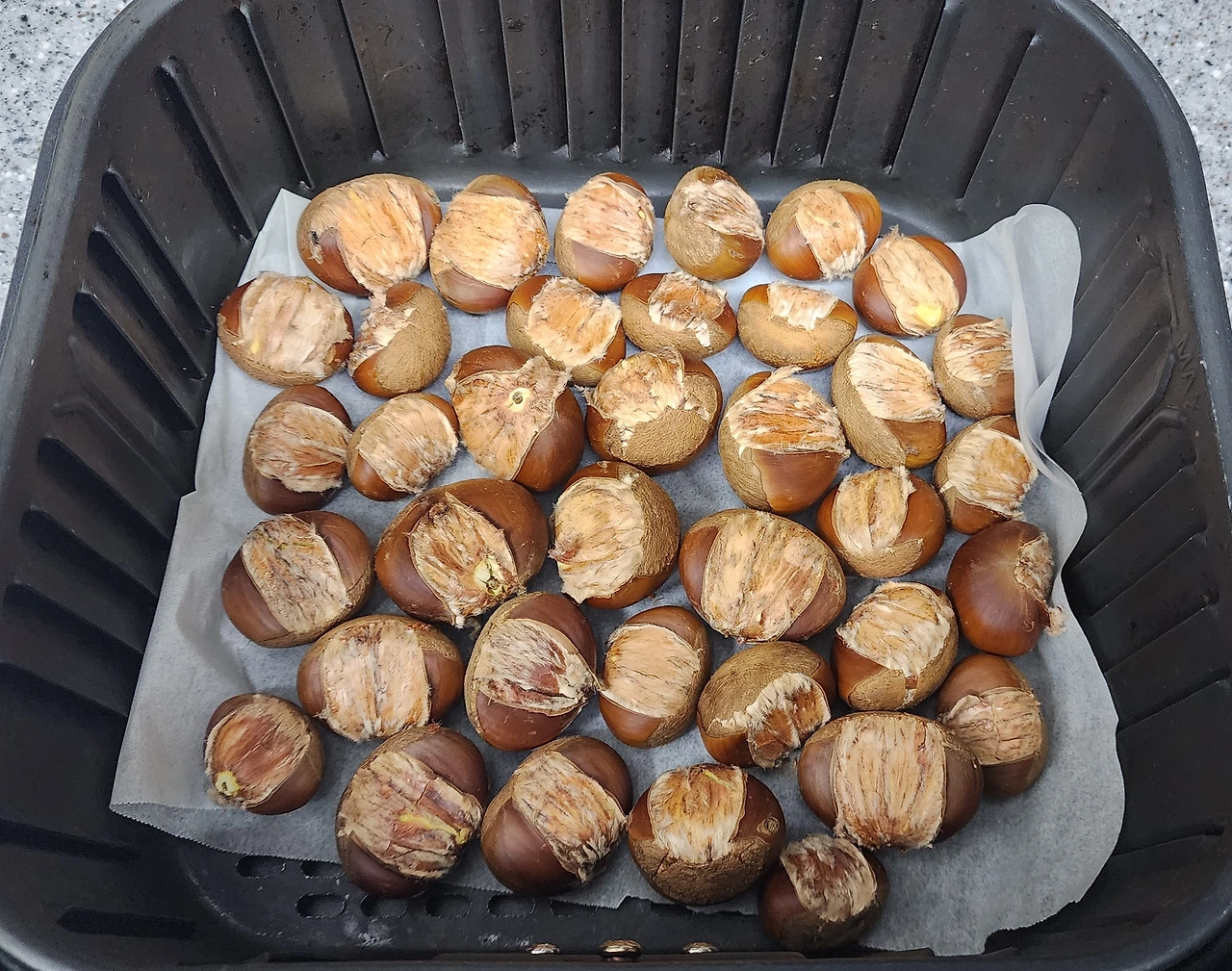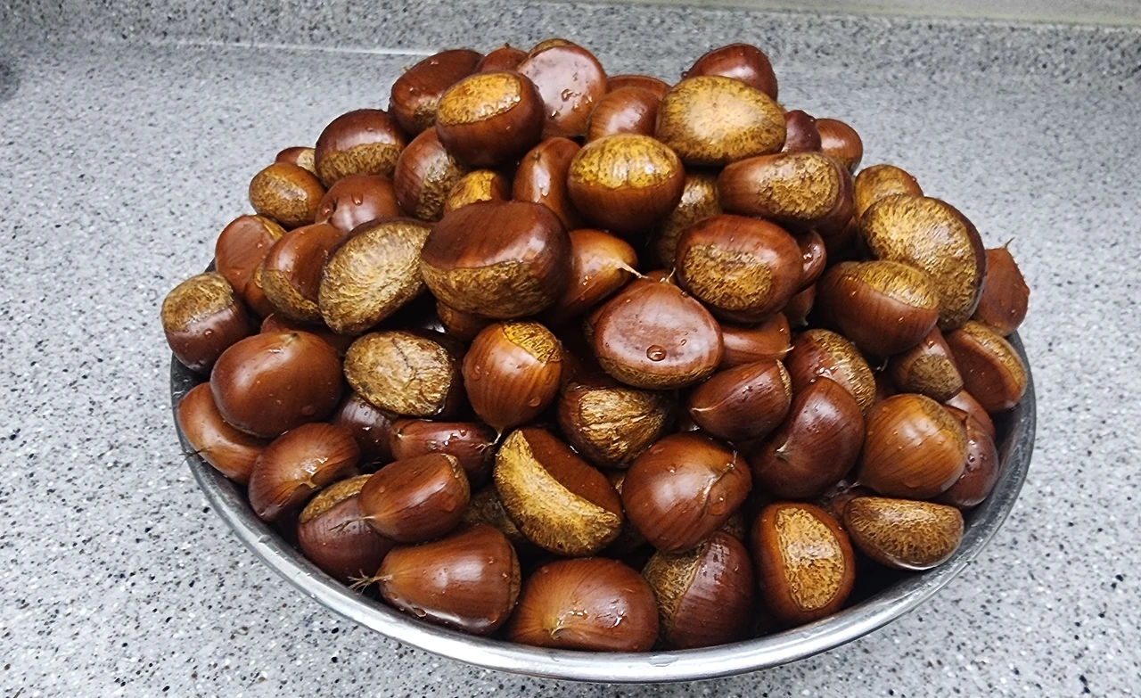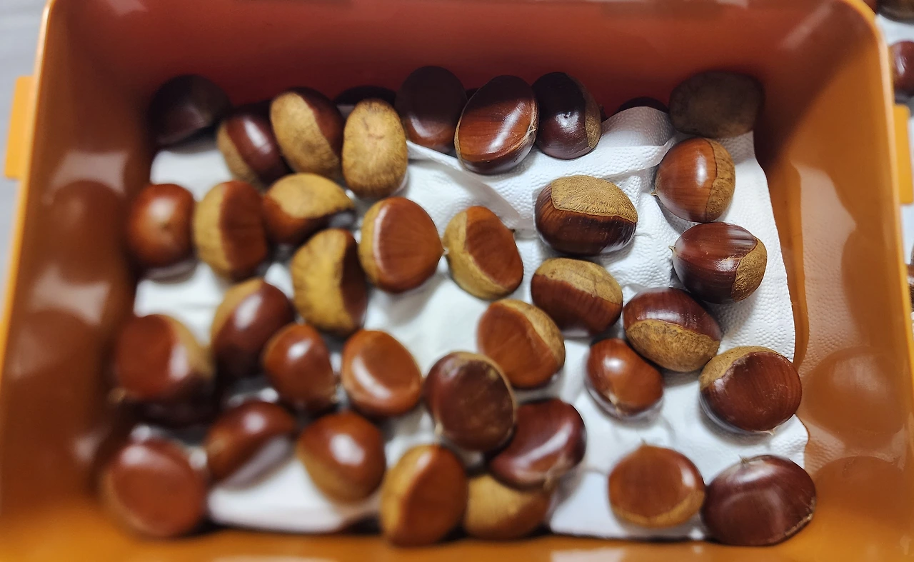 주워온 밤은 꽤 많았다. 물에 담갔을 때 물 위에 뜨는 것은 벌레 먹은 거라서 버려야 한다. 벌레 먹은 것은 꼭 골라내고 밤을 물에 여러 번 깨끗하게 씻어서 물기를 제거하고 하나씩 행주나 키친타올로 물기를 닦아준다. 켜켜이 키친타올이나 신문지를 넣어 습하지 않게 통에 담아서 김치냉장고에 보관하면 오래 먹을 수 있다. 먹을 때 꺼내서 삶아서 먹거나 깎아서 생밤으로 먹으면 된다. 가끔 집에서 전기밥솥에 약밥을 만들어 먹는데 껍질을 벗겨서 약밥에 넣어 먹으면 좋다. 우리 집은 껍질을 조금 벗겨서 애어프라이어에 구워서 먹기도 한다.