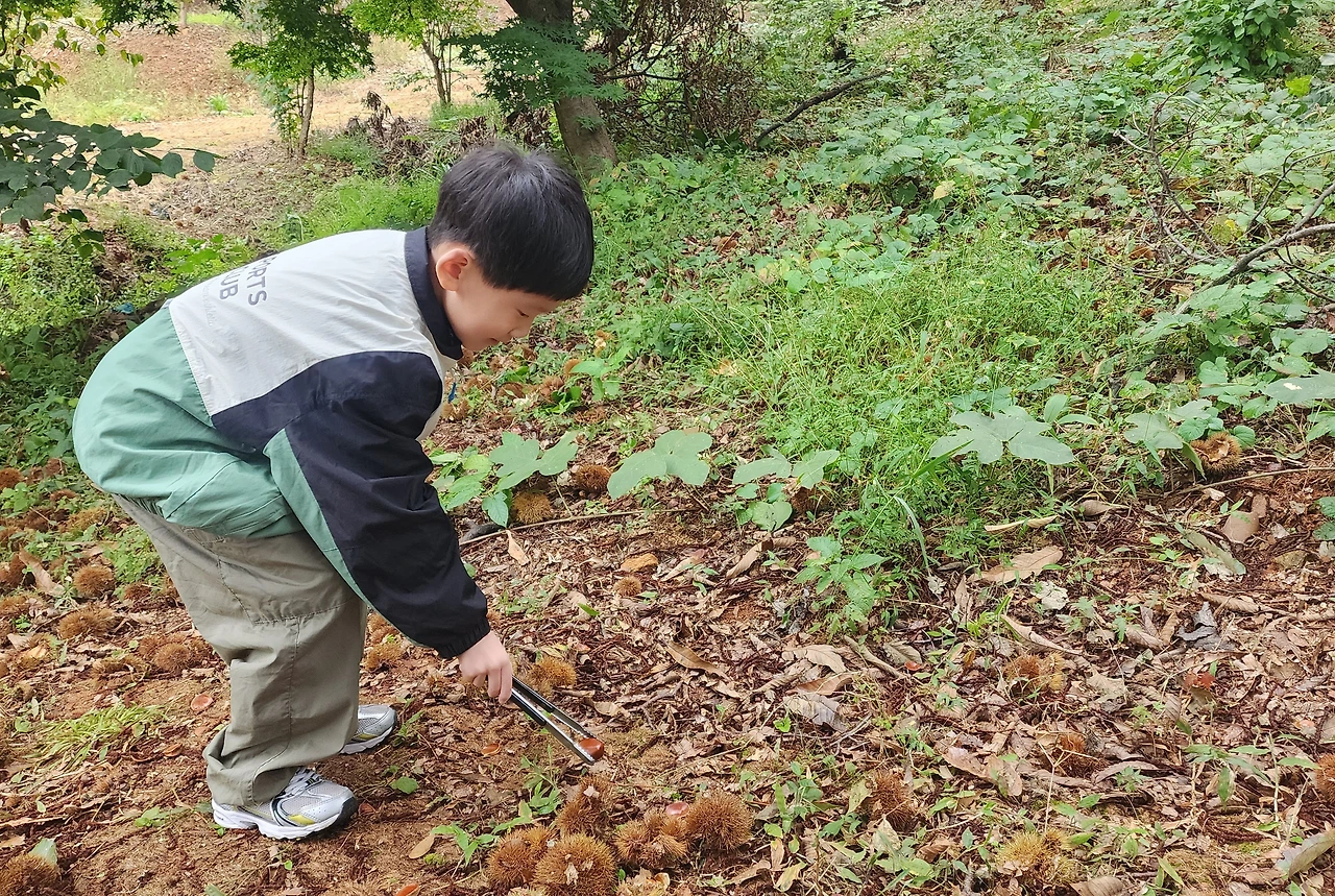 여기저기서 들려오는 목소리다. 눈을 크게 뜨고 밤이 있는지 살피는데 알밤이 그냥 떨어진 것도 있고 밤송이 채로 떨어진 밤도 있었다. 집게로 밤을 줍고 밤송이 속에 있는 밤도 집게로 꺼냈다. 벌레 먹은 밤도 많아서 알밤 줍는 것이 꼭 보물찾기 하는 것 같았다. 봉지에 밤이 늘어나는 만큼 보물찾기 재미도 솔솔 늘어났다.