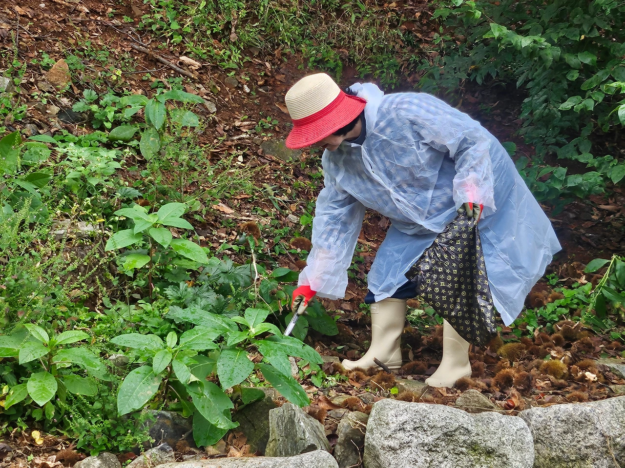 아침에 일어나니 비가 조금씩 내려서 밤을 주울 수 있을까 걱정이 되었는데 비옷을 챙겨 남편과 출발했다. 성전은 집에서 차로 10분 정도의 거리인데 다행히 가는 동안 비는 그쳤다. 밤을 주우러 온 성도님들 복장도 가지각색이다. 장갑을 끼고 운동화나 장화를 신고 모자를 쓴 사람들이 손에 봉지와 집게를 들고 밤나무 밑으로 들어갔다. 나도 밤송이에 찔리지 않으려고 장갑을 끼고 장화를 신고 모자를 쓰고 왔다. 오늘 목표는 한 봉지다.