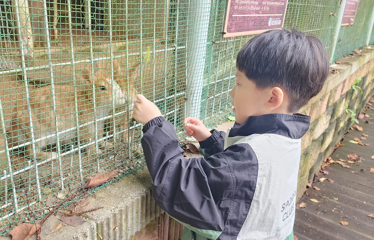 산에서 내려와 미니 동물원에 갔다. 제2 성전에는 몇 가지 동물이 있다. 토끼가 몇 마리 있었는데 풀을 주자 손자 앞으로 토끼가 다가왔다. 풀 먹는 토끼가 귀여운지 손주는 토끼 곁을 떠나지 않았다. 미니 동물원에는 공작새가 구석에서 알을 품고 있었는데 공작새까지 구경하는 행운을 얻었다. 나도 공작새가 알을 품고 있는 것은 처음 보았다. 닭이 알을 품는 것처럼 공작새도 알을 품고 있었다. 밤 줍기도 좋았지만 손자들에게 동물 보는 것이 더 즐거워 보였다.
