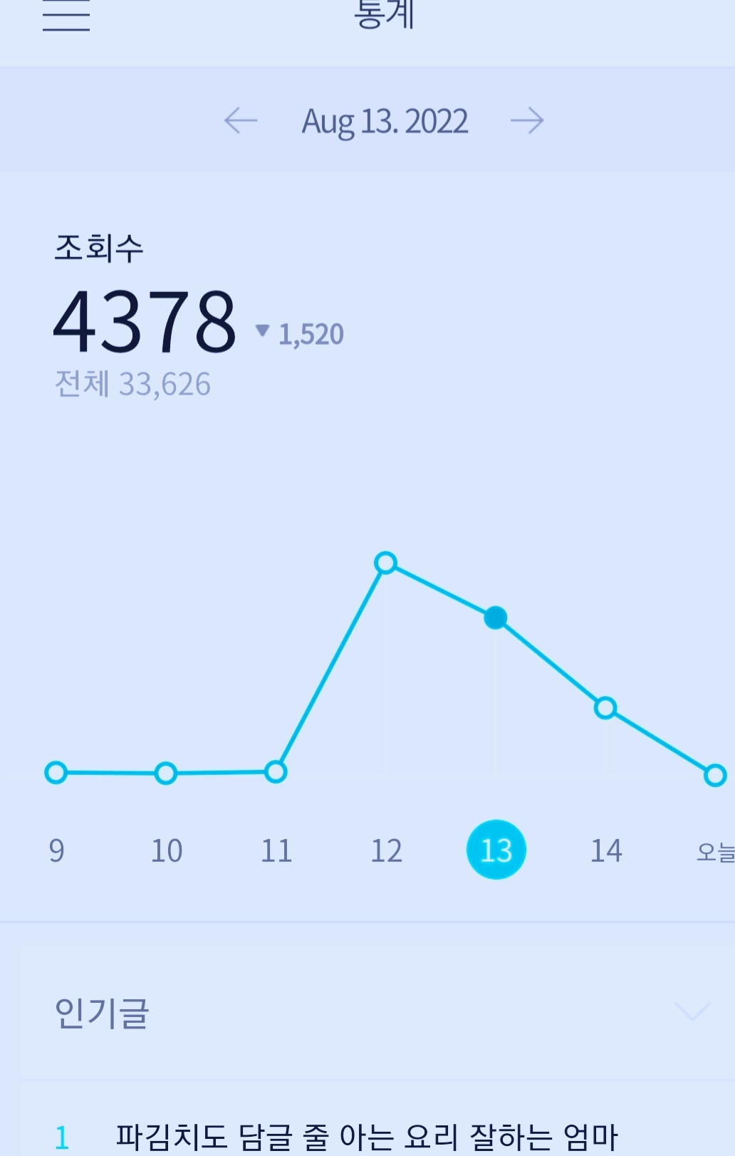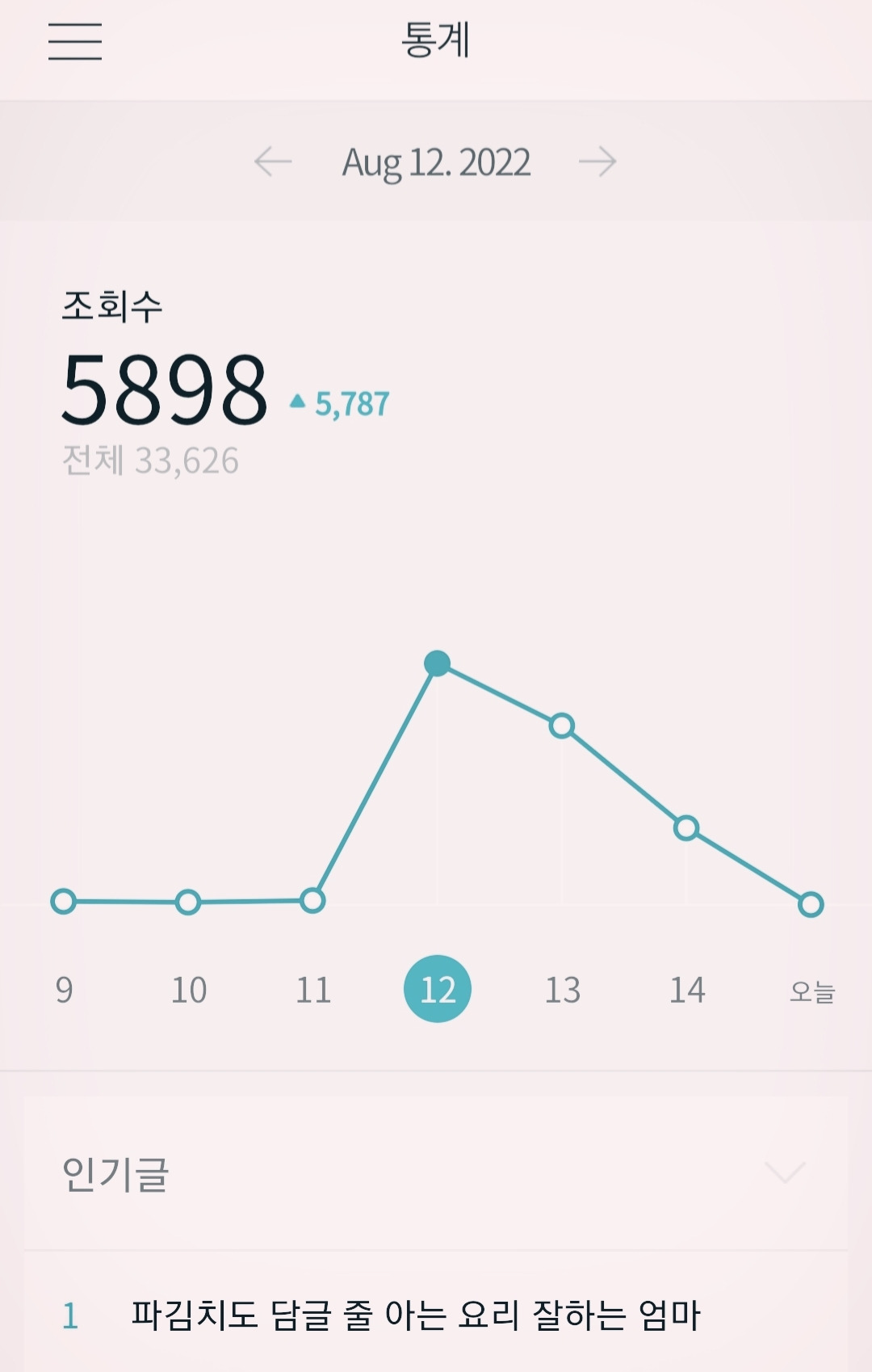 '커피차는 연예인만 받는 줄 아셨지요'의 지금까지 총조회수가 14,448을 기록해 단연 인기글 1위 자리를 지키고 있다. 그다음을 '파김치도 담글 줄 아는 요리 잘하는 엄마'가 지금까지 11,631로 뒤를 이었다. 지금도 계속 조회수가 올라간다. 두 글이 내 브런치의 효자 글이 되었다.