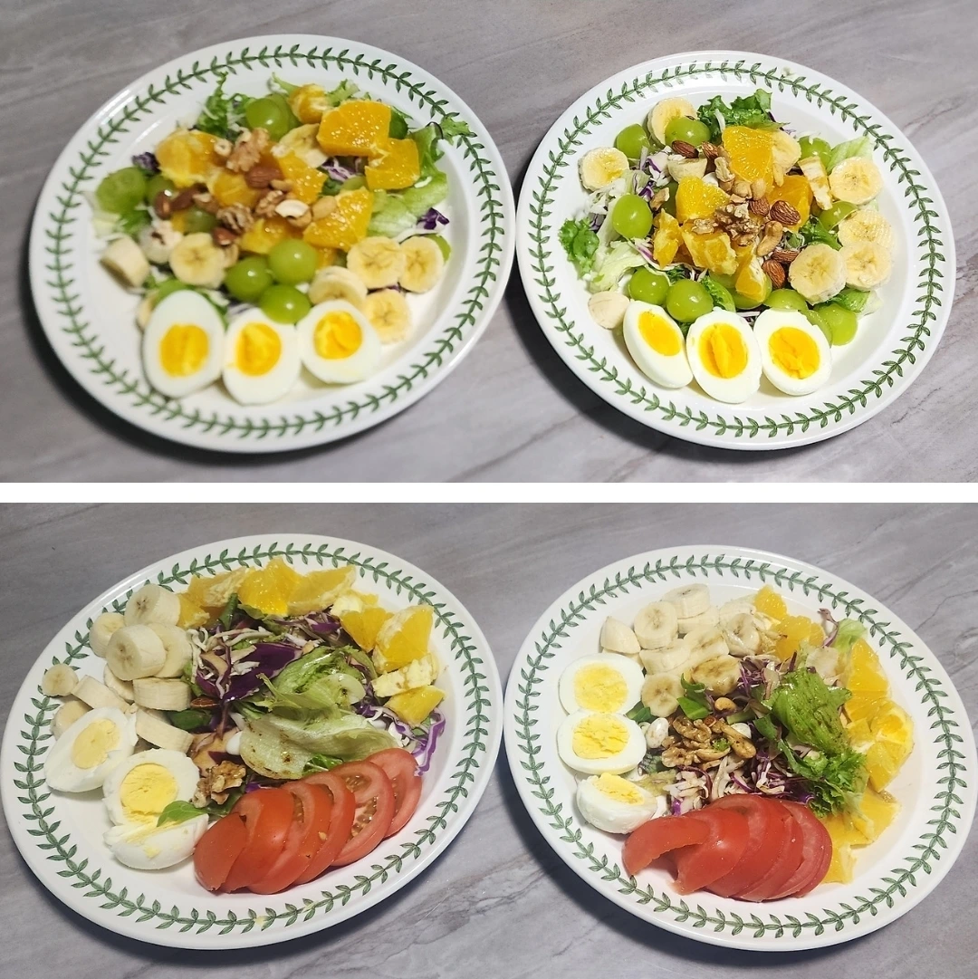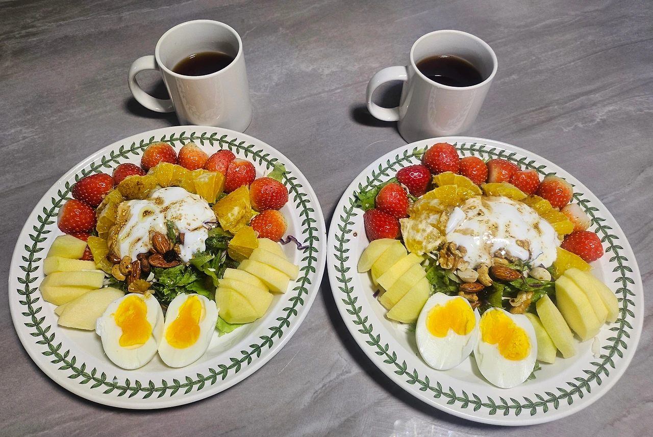 요즘 아침에는 주로 샐러드를 만든다. 남편이 달걀을 삶고 커피를 내리고, 나는 과일을 깎아 샐러드를 만든다. 둘이 분담해서 준비하니 시간도 단축되고 준비하는 재미가 있다. 남편의 달걀 삶는 실력이 점점 좋아져서 요즘 먹기에 딱 좋게 달걀노른자가 살짝 덜 익게 삶는다. 샐러드에는 견과류도 꼭 넣고, 올리브오일과 발사믹 식초, 레몬즙으로 드레싱을 만든다.