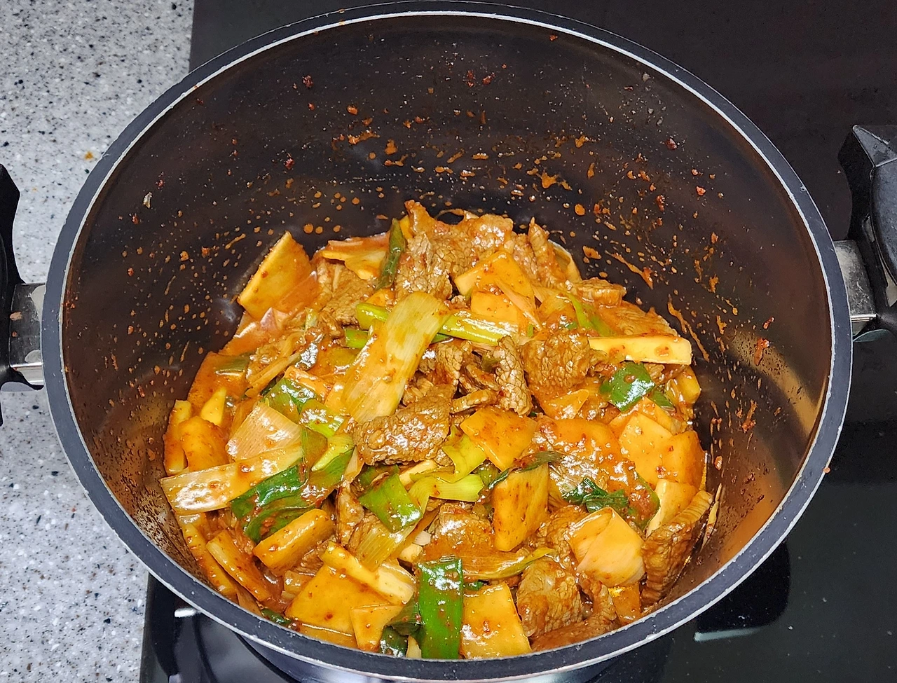 5. 볶아놓은 재료에 물 2리터를 넣고 강불에 올려준 다음 느타리버섯과 고사리를 넣어둔다(이때 쌈장 한 숟가락을 넣어주면 국물 맛이 깊어진다.).
