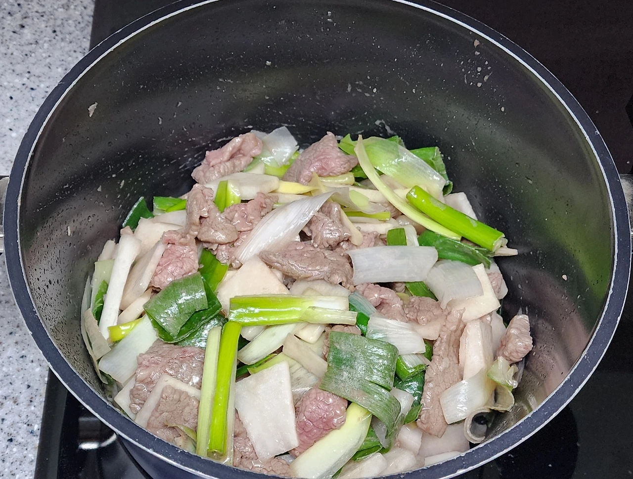 2. 파를 넣고 고기와 잘 섞어준 후에 나박나박 썬 무를 넣고 볶아준다.