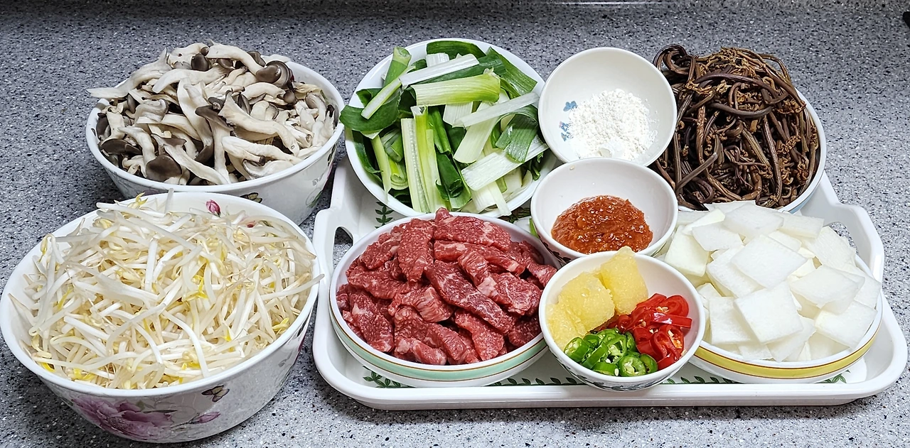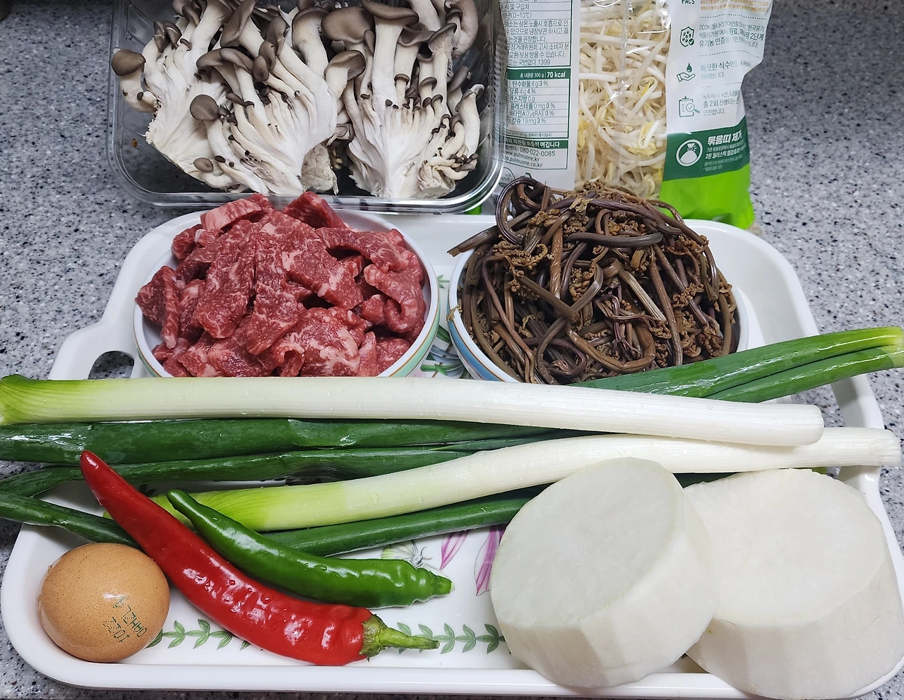 소고기 양지 500g, 숙주나물 한 봉지(300g), 삶은 고사리 두 줌, 대파 두 대, 느타리버섯 한 팩, 무 두 토막, 달걀 한두 개(홍고추와 청양고추는 집에 있어서 넣었다.)