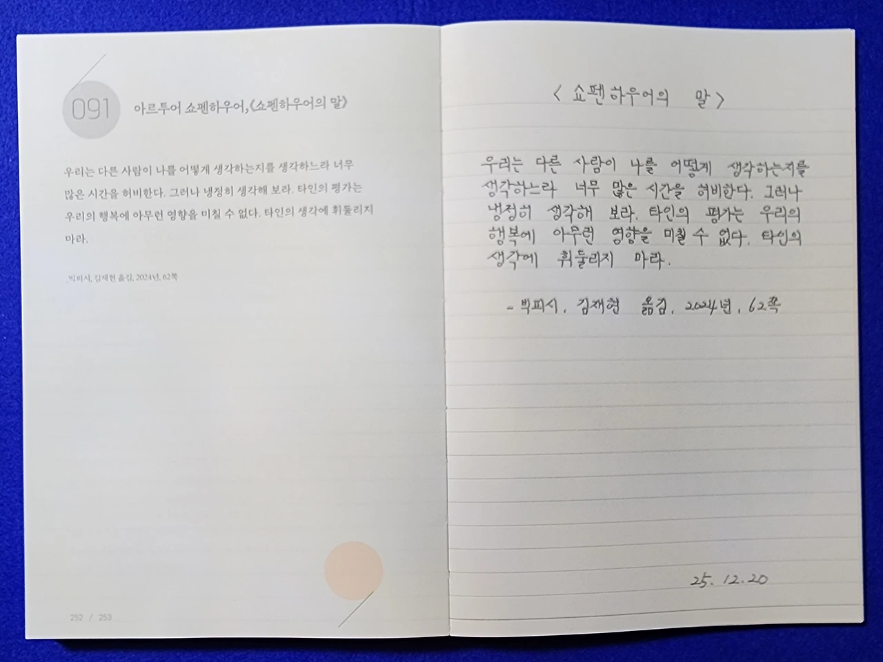 필사책에는 명문장이 많이 들어있다. 마음에 닿는 문장도 많았다. 2025년 한 해를 돌아보면 기사 댓글 하나에 상처받기도 했고, 다른 사람 말 한마디에도 며칠씩 우울했다. 새해에는 내가 인생의 주인공이라고 생각하고, 쇼펜하우어의 말처럼 타인의 생각에 휘둘리지 않는 1년이 되길 바란다.