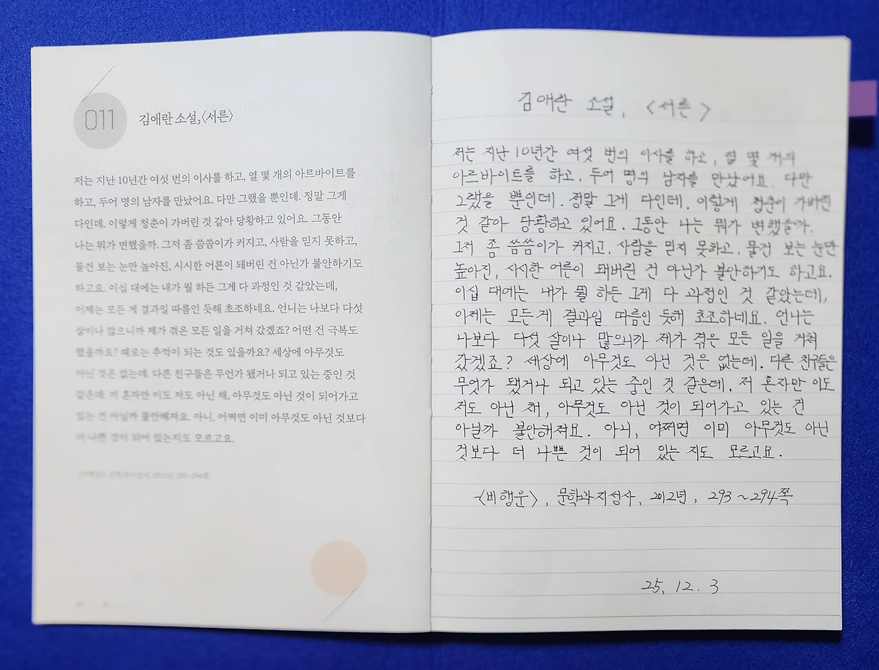 12월 1일부터 필사를 시작했다. 예전에도 늘 시를 필사했기에 어렵지 않았다. 매일 아침 필사하며 왠지 2025년을 잘 마무리하는 것 같아서 뿌듯했다. 내가 좋아하는 문장 앞에서는 잠시 멈추어 한 번 더 읽어보고, 정말 한 자 한 자 정성 들여 써 내려갔다. 내년에는 내 어휘력도 늘어나서 글쓰기 실력도 좋아지길 바라는 마음이었다.