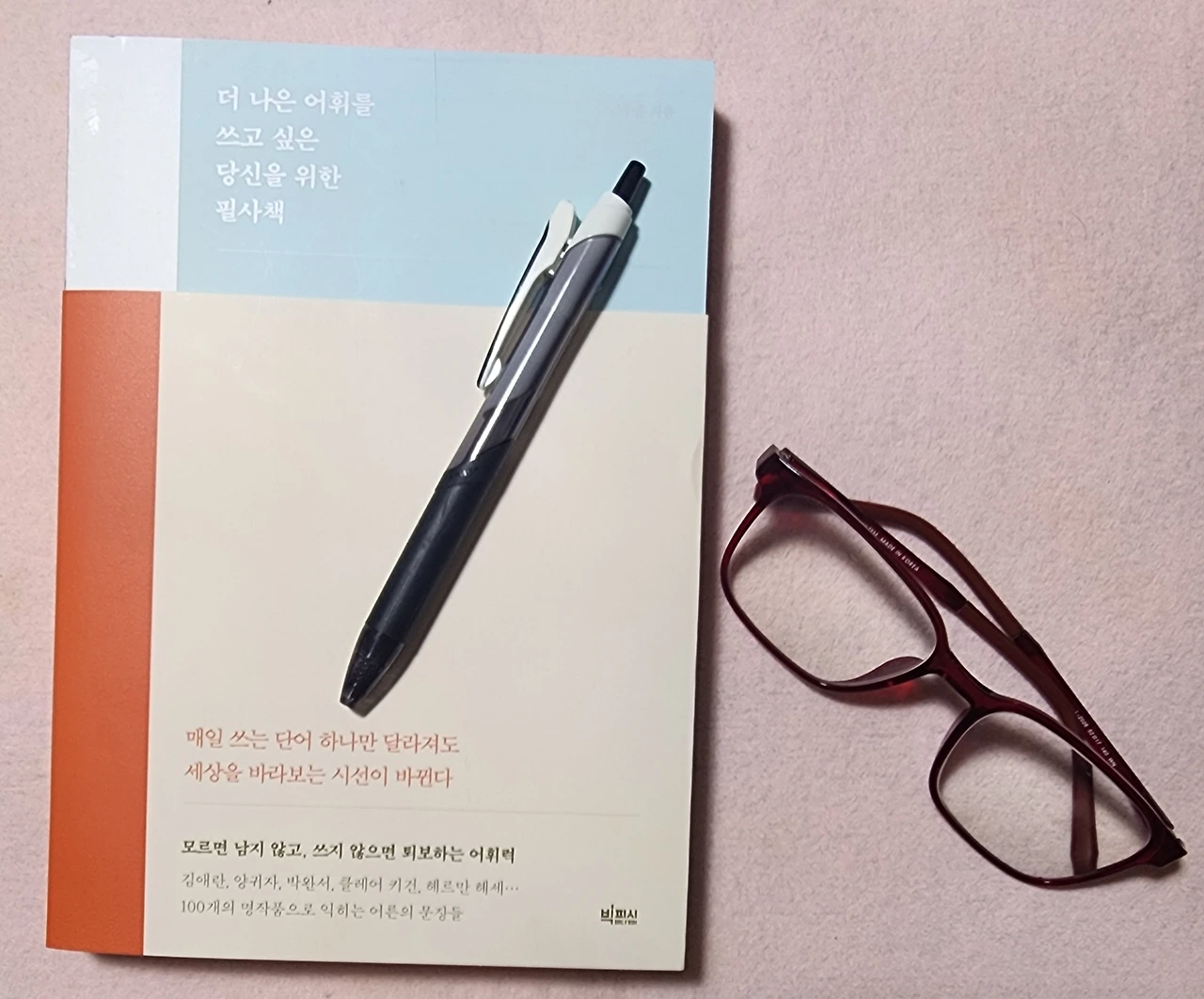 나는 글 쓰는 사람이다. 오마이 뉴스 시민기자로, 브런치 작가로, 출간 작가(2025년 6월에 <주말마다 손주 육아하는 할머니 >를 출간함)로 2025년 한 해도 꾸준하게 글을 썼다. 글 쓰는 사람으로 한 달 남은 12월을 어떻게 보내는 것이 일 년을 잘 마무리하는 일이 될까 생각하다가 필사가 떠올랐다. 요즘 필사책도 많아서 검색하다가 이주윤 작가가 쓴 <더 나은 어휘를 쓰고 싶은 당신을 위한 필사책>(24년 11월 초판)을 주문했다.