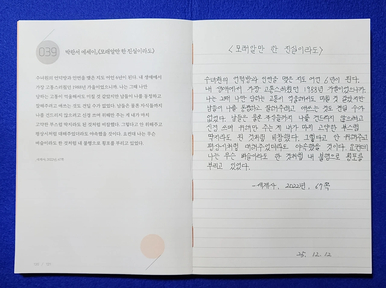 필사 문장에는 내 마음을 뒤흔든 문장이 많았다. 2025년을 보내면서 한 문장 한 문장 읽으며 마음에 새겨야겠다.