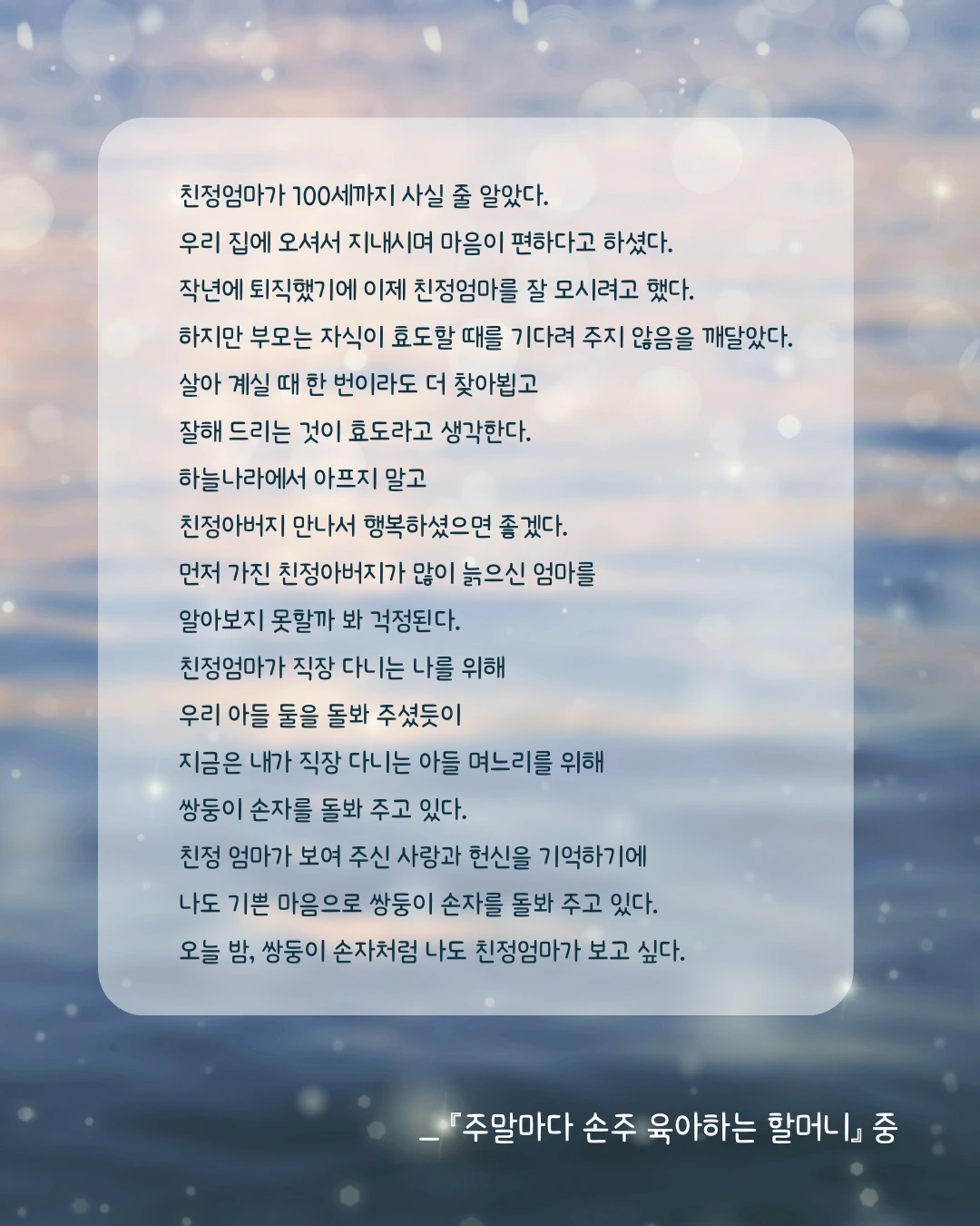 올 6월에 <주말마다 손주 육아하는 할머니>를 출간하고 브런치 작가님들께 과분한 사랑을 받았다. 책을 구입해 주시고, 희망도서로 신청해 주시고, 많은 작가님께서 리뷰로 응원해 주셨다. 브런치의 귀인 류귀복 작가님은 용돈이 조금 여유 있다고 책을 주문하셔서 서평단까지 모집해 주셨다. 날개 없는 천사임이 분명하다.