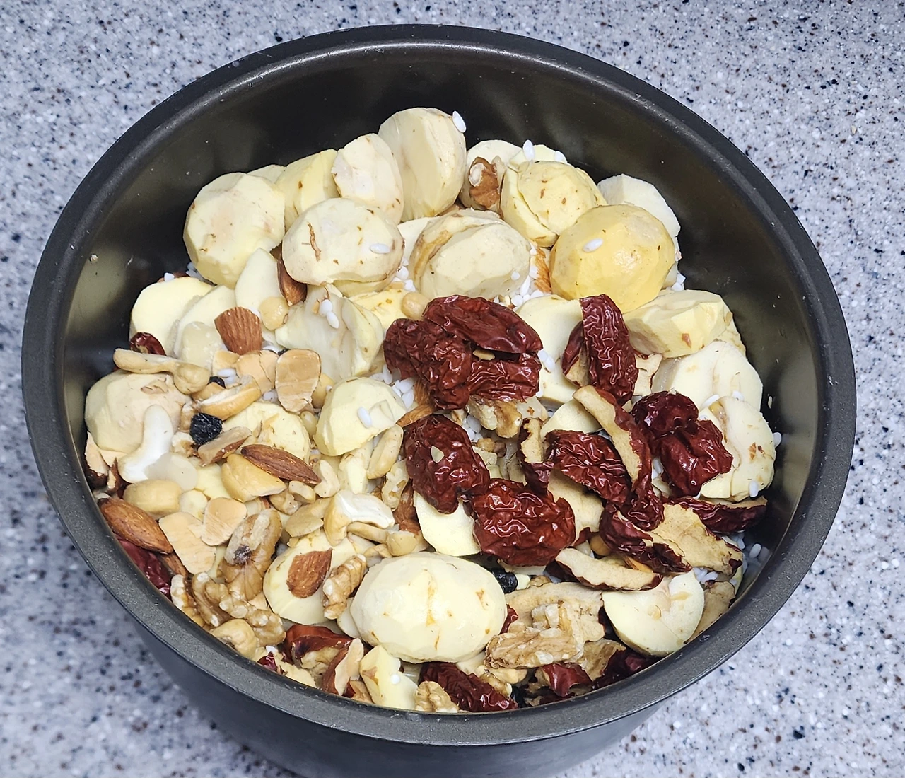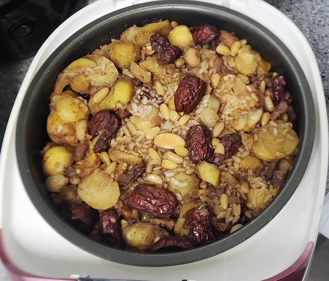전기밥솥으로 설 연휴에 먹을 두 번째 간식으로 약밥을 만들었다. 미리 준비해 둔 밤과 대추, 잣, 견과류 등을 넣어서 약밥을 만들었다(간편 약밥 만드는 법 ). 밤을 넉넉히 넣은 약밥도 맛있게 만들어졌다. 만든 약밥은 금방 먹을 것만 남기고 먹기 좋게 하나씩 포장해서 냉동실에 넣어두었다. 먹을 때 미리 꺼내두면 자연 해동되어 맛있다.