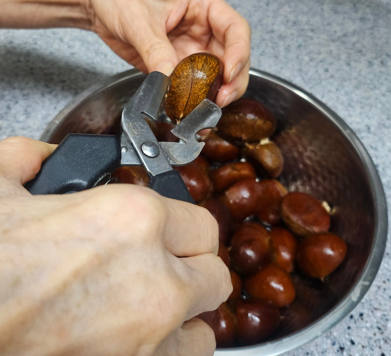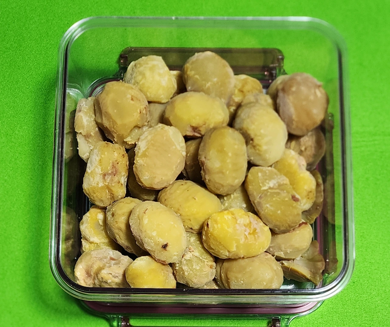 곧 설 연휴라 밤이 꽤 비싸다. 차례상에 올리는 깐 밤은 더 비싸다. 가을에 넉넉하게 보관한 밤을 꺼내서 설날에 먹을 간식을 만들어야겠다고 생각했다. 보관한 밤은 가을에 보관한 채로 상하지도 마르지도 않고 싱싱했다. 정말 신기했다. 나도 남편도 생밤을 좋아해서 우선 밤 껍데기를 벗겨서 간식으로 먹을 생밤을 만들었다.