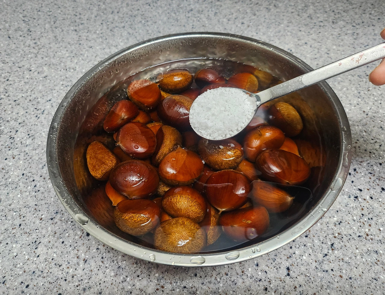 -소금물 담가두기: 밤이 잠길 정도의 물에 소금 1큰술을 풀고, 약 30분~1시간 정도 담가주세요.