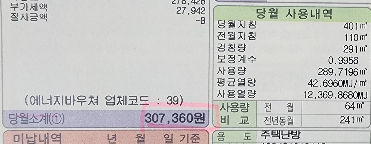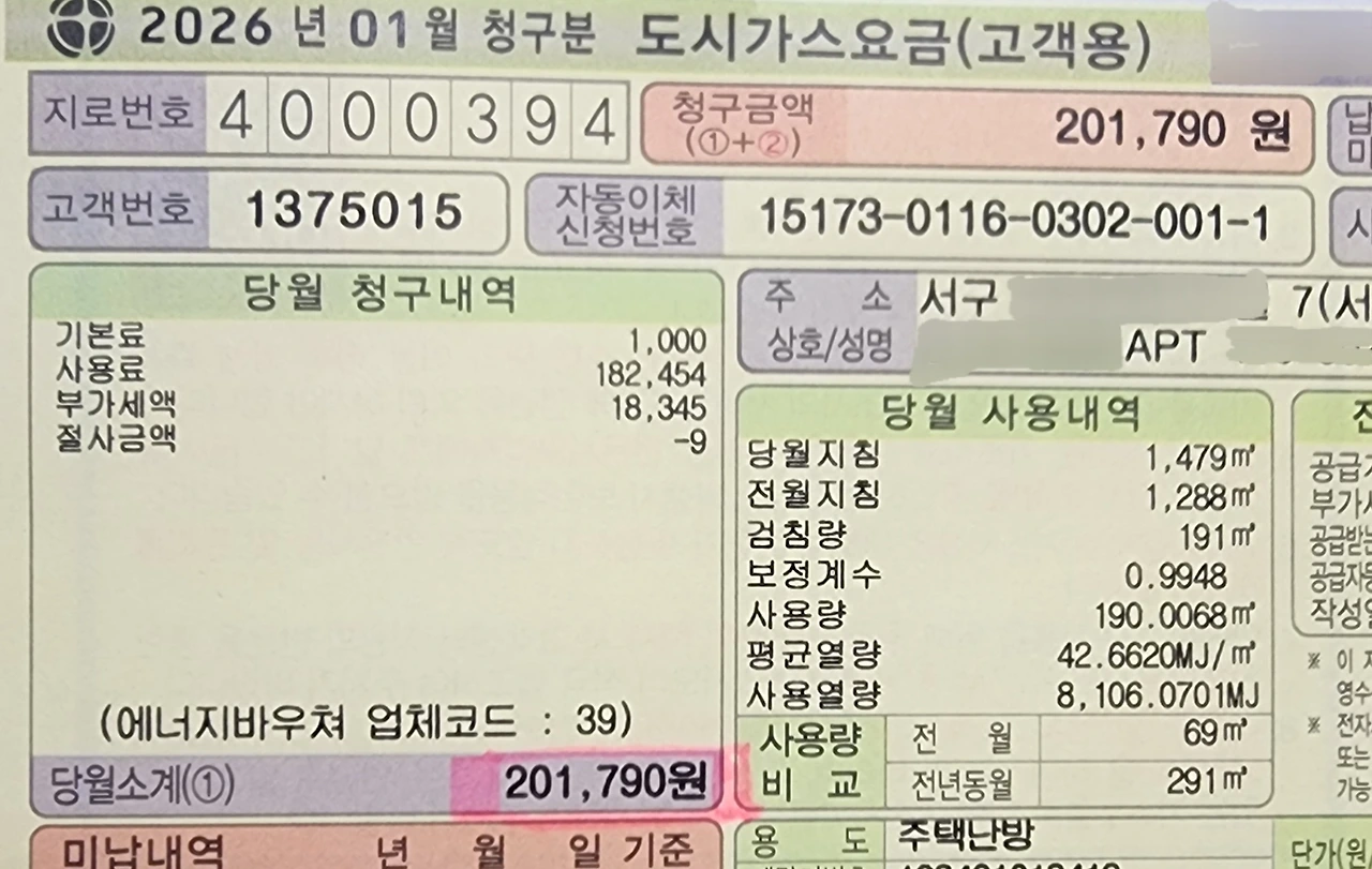 1월 초에 도시가스 직원이 가스 점검을 위해 방문했다. 우리 집에서 사용한 가스비가 궁금해서 여쭤보았다.