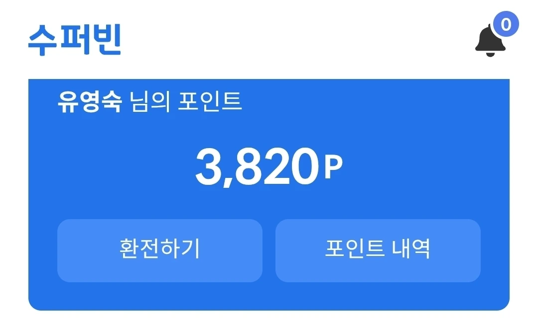 지난해부터 네프론으로 받은 포인트는 수퍼빈 앱에 누적되는데 지금 삼천팔백이십 점이다. 이 포인트는 환전하면 그대로 현금으로 통장에 들어온다. 20리터 종량제 쓰레기봉투 한 장이 육백이십 원이라 이번에 삼천칠백이십 원을 환전하여 20리터 종량제 쓰레기봉투 6장을 샀다. 적다면 적은 돈이지만, '버는 돈'에 속한다.