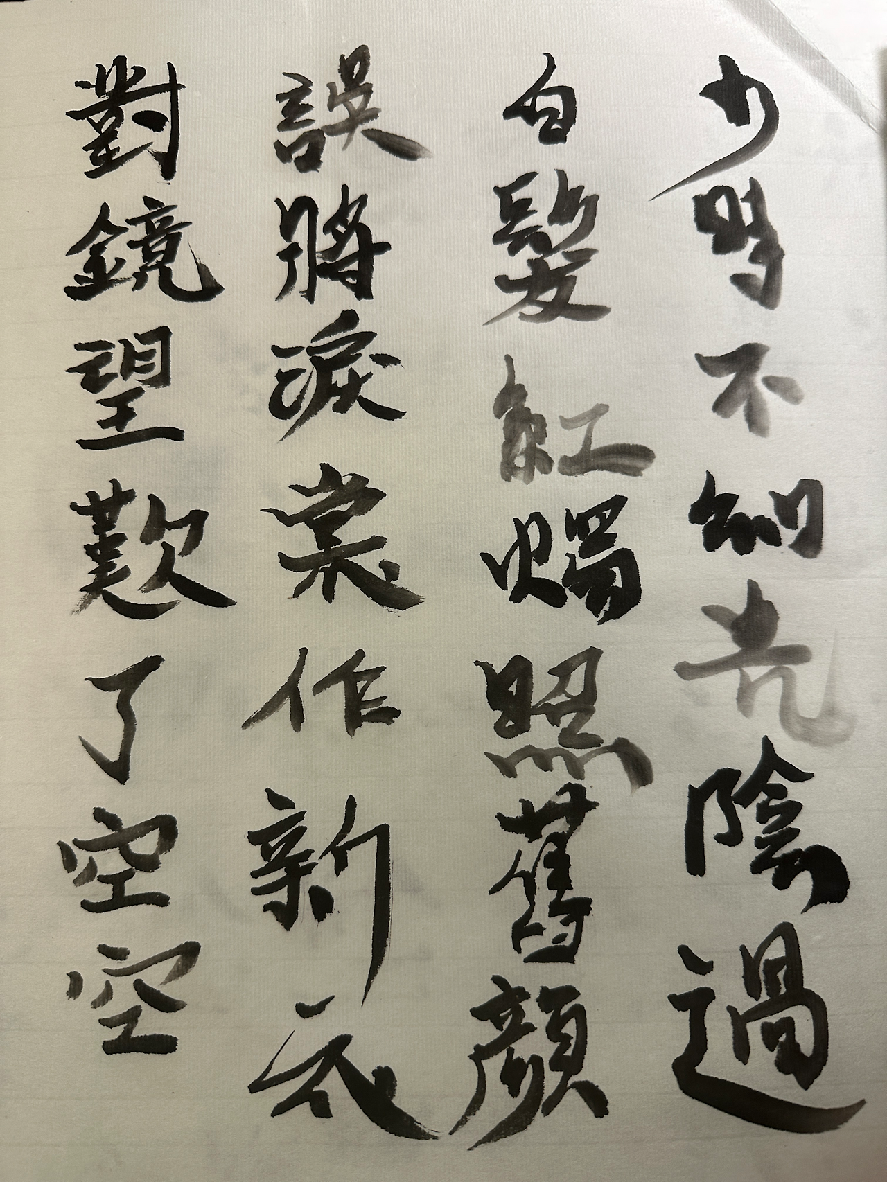백발은 홍촉 아래 옛 얼굴을 비추도다.