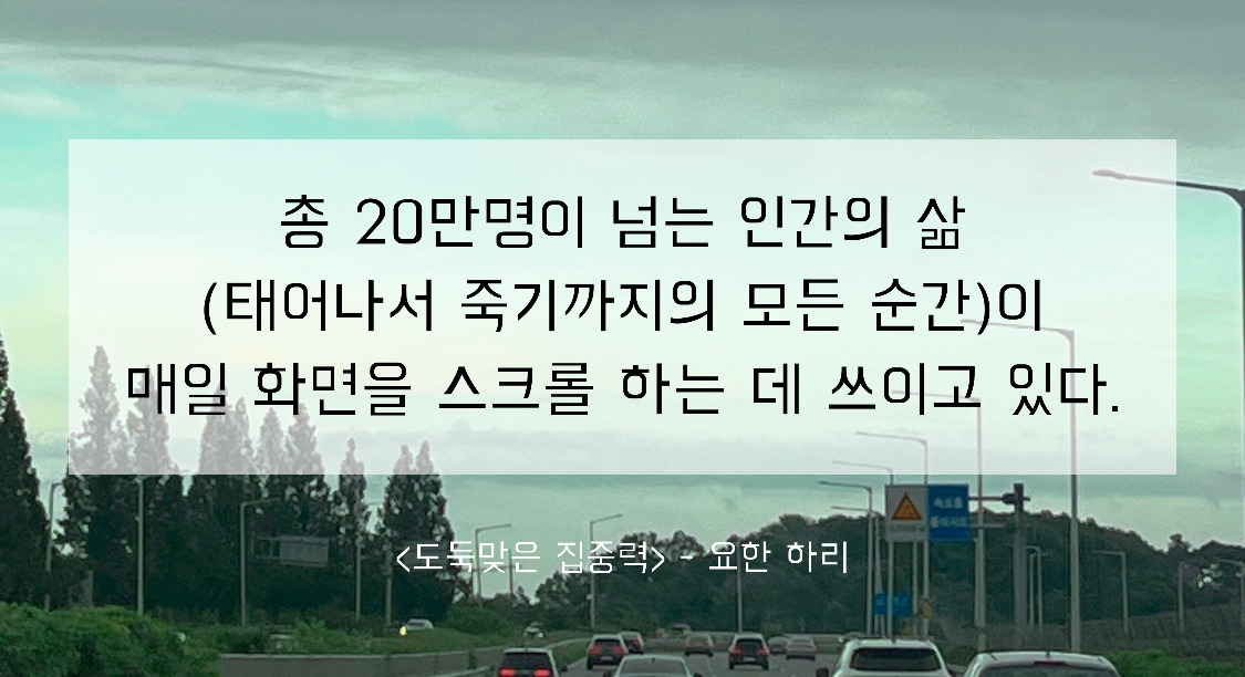 <도둑맞은 집중력> 책에 의하면, 총 20만명이 넘는 일생이 매일 화면 스크롤 하는데 쓰이고 있다고 한다. 이 결과를 보며 나는 말할 수 없이 큰 허무함을 느꼈다. 보석같이 귀한 생이 무한 스크롤의 시간들로 그냥 사라지다니. 동시에 나는 그 위험성을 심각하게 느꼈다. '사실 내가 의지가 약해서 휩쓸려 가는 것이 아니구나', '나라는 사람이 계속해서 그곳에 머무를 수 있도록 수백수천의 개발자들이 장치를 심어 두고 나를 파악하고 있었구나', '흘러가는 게 삶이라지만 그냥 흘러가는 대로 나를 두는 것은 생각보다 매우 위험한 일이구나'같은 기저의 생각들을 깨달을 수 있었다.