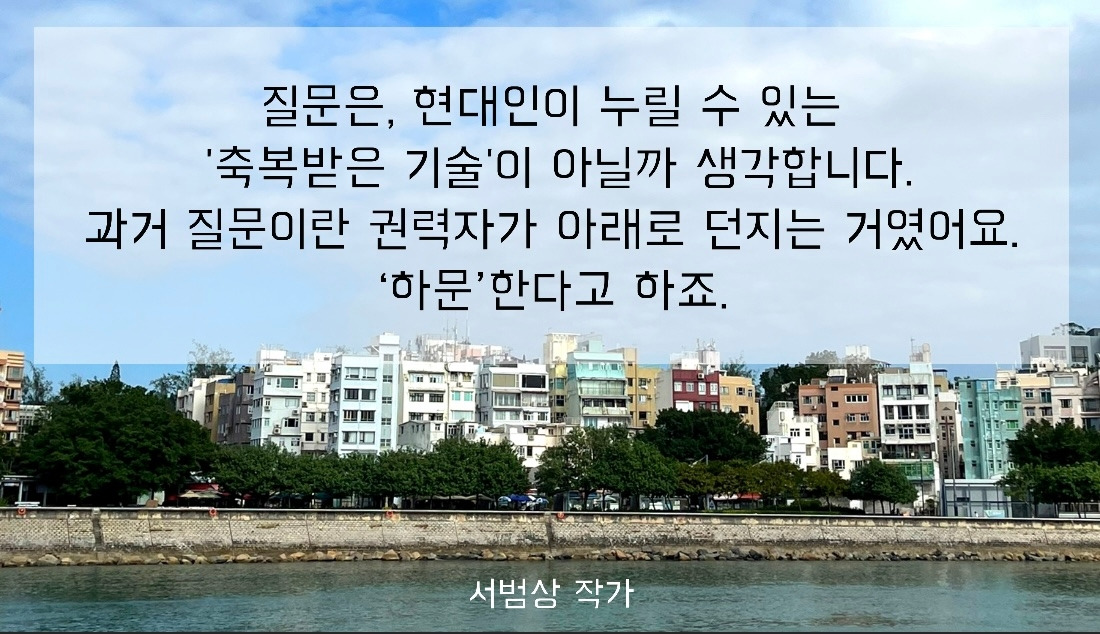 과거에 질문은 위에서부터 내려와 하문하는 것이 일반적인 형태였으나, 이제는 나이 권력 등 사람을 둘러싼 껍데기를 막론하고 할 수 있는 형태로 변했다. 심지어 챗GPT라는 간편한 질문의 대상도 하루가 다르게 거듭나고 있으니 질문을 하지 않을 이유가 없다. 이제는 질문에 대한 프레임을 다시금 정돈하고, 더 귀하게 활용해보려 한다.