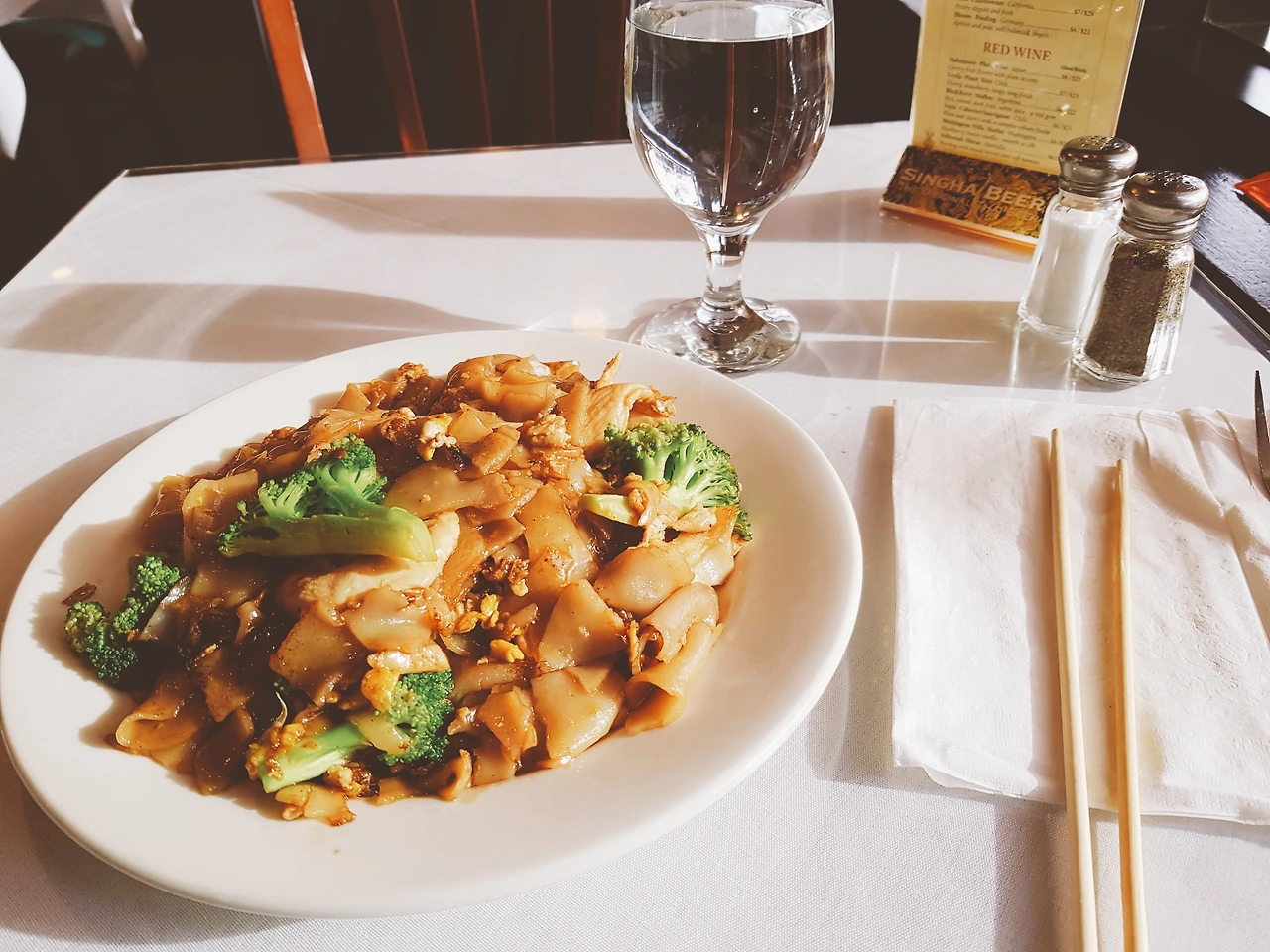 아주 조금 더 걸어가야 하는 다운타운 쪽에는 조금 분위기 있는 타이 음식점도 있었다. 여기는 내부에 앉을 수 있는 공간이 조금 더 넓었다. 이 가게는 팟씨유를 처음으로 먹어본 곳이다. 팟타이와 비슷하게 간장 베이스로 볶은 국수이지만 면 너비가 훨씬 더 넓었다.