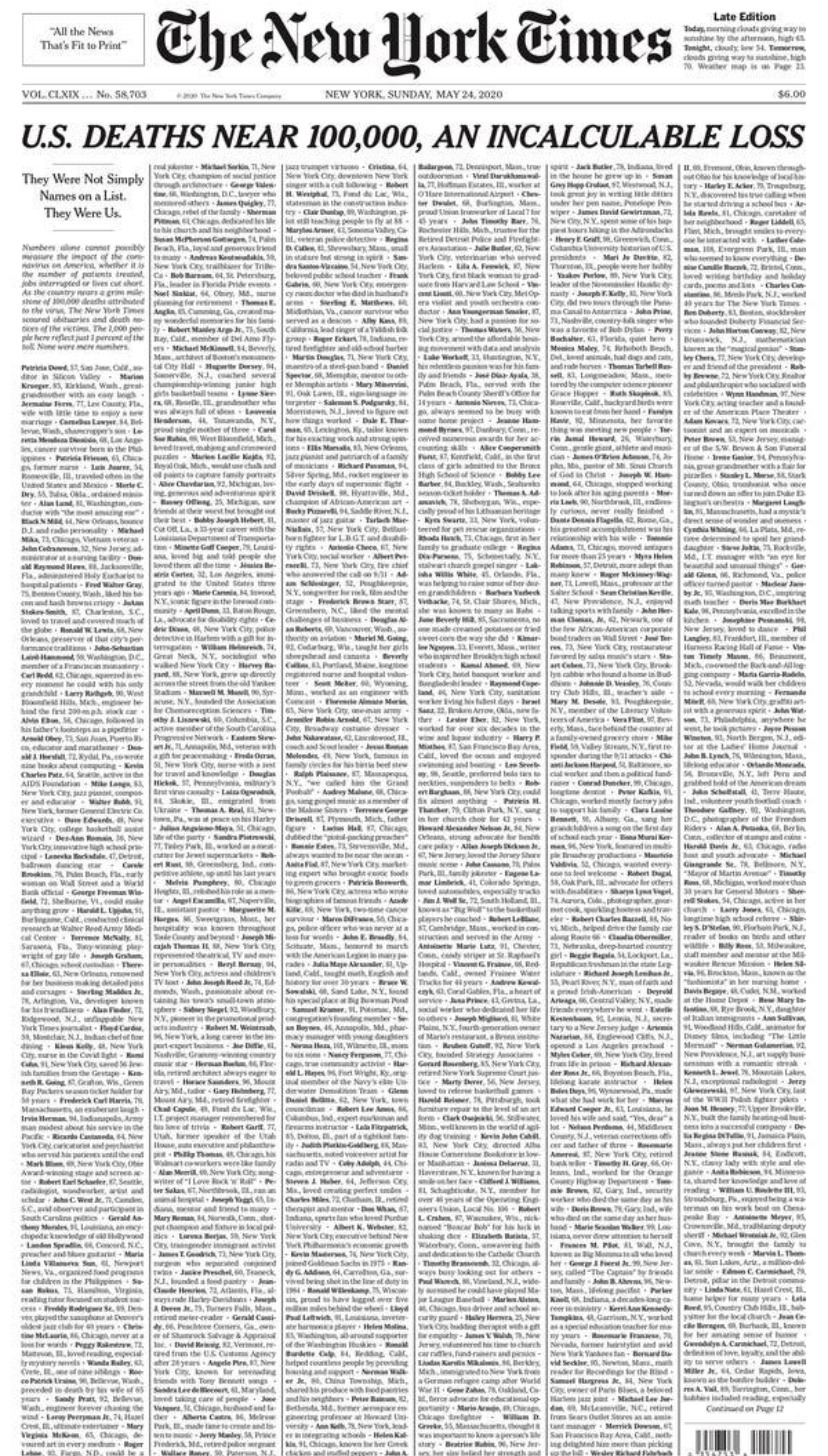 2020년 뉴욕타임스에서 1면에 코로나19로 사망한 사람 천 명의 이름과 짧은 부고를 적은 추모 기사를 낸 적이 있다. 그 기사가 많은 사람들에게 위로가 되어 화제였다. 나도 그 기사를 보고 왜인지 모르게 위로가 되고 눈물이 날 것 같았던 기억이 있다.