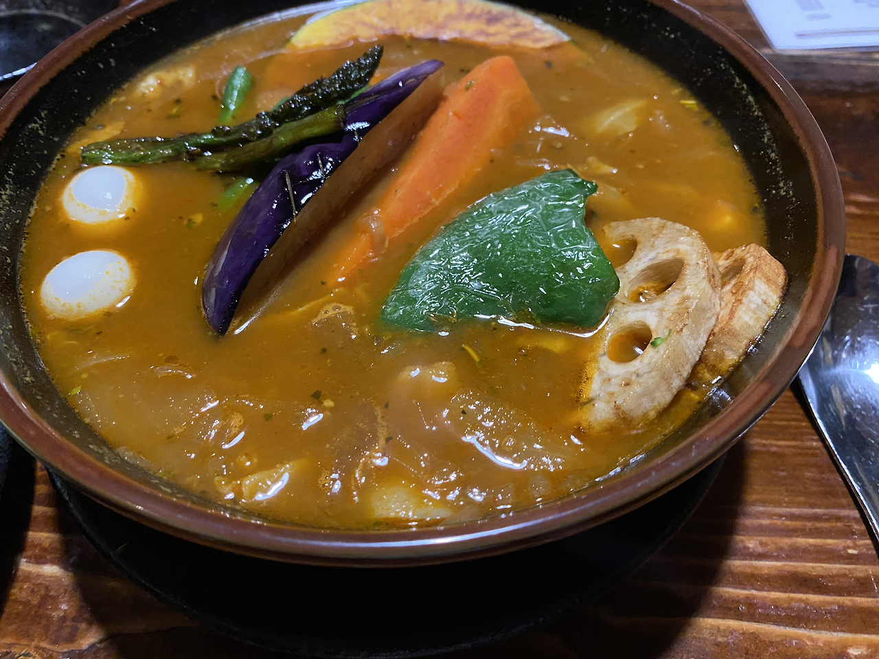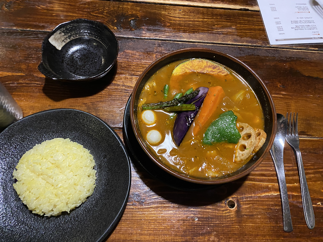 카레수프는 말 그대로 카레로 만든 수프였는데 생각보다 국물이 진했다. 그리고 가지, 당근, 연근, 단호박 등 다양한 채소들이 큼지막하게 들어가 있어서 건강식 느낌이었다.