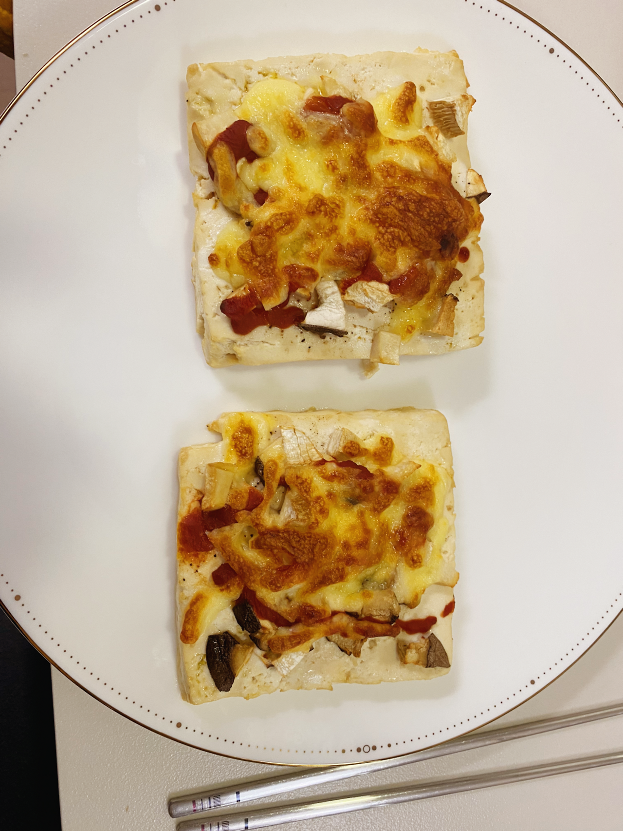 두부를 네모나게 자르고 살짝 프라이팬에 굽는다. 그다음 다이어트 케첩을 뿌려주고 모차렐라 치즈를 얹어 에어프라이어기에 5-10분 정도 돌리면 끝이었다. 여유가 되면 버섯이나 양파도 같이 얹어주면 더 맛있다.