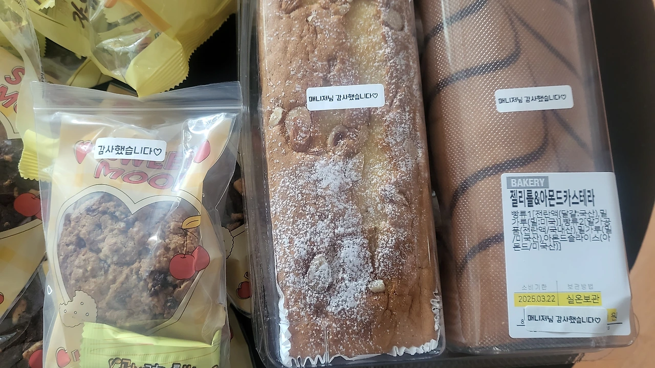 동료들과 매니저 선물로 쿠키와 케이크를 사러 아침 일찍 트레이더스엘 왔다