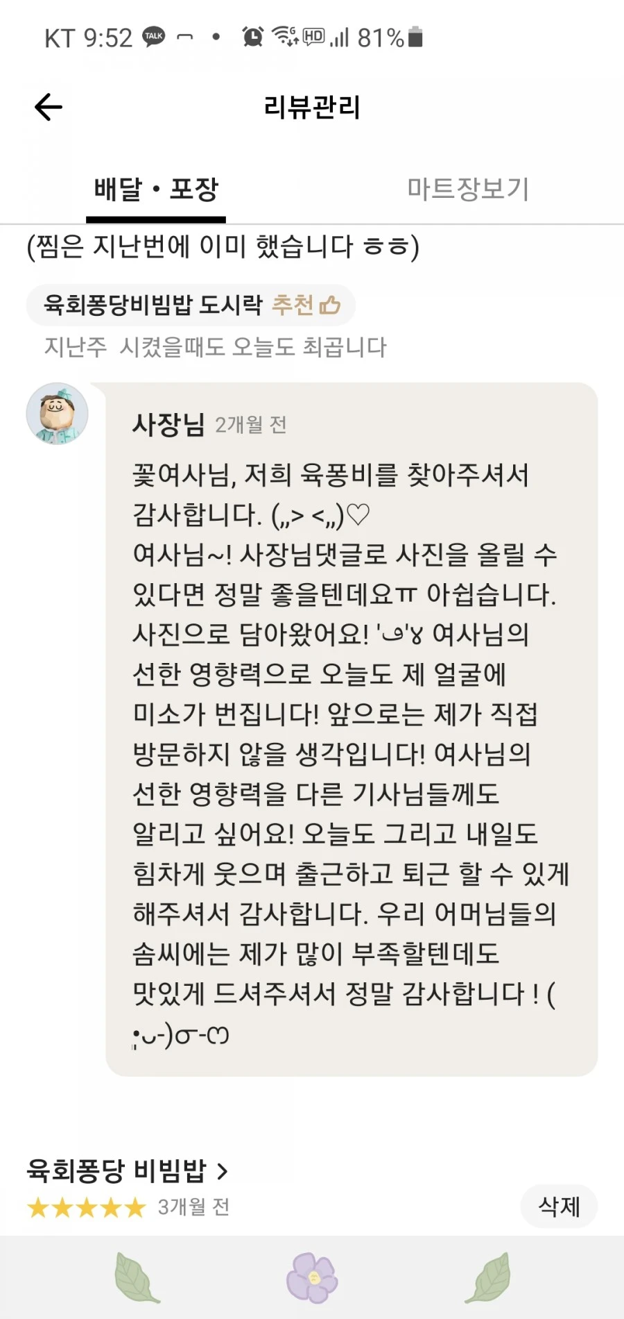 딸아이가 육회를 좋아해 배민으로 주문을 하고