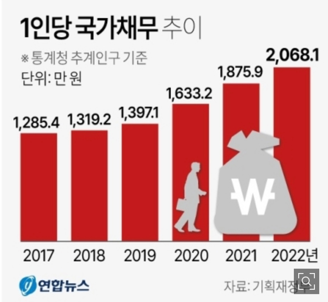 국가 채무가 사상 최고치를 기록하고 있다는 뉴스가 해마다 반복되고 있다. 국가 채무를 인구수로 나누면 국민 1인당 갚아야 할 빚이 나오는데, 그 금액이 2022년 기준으로 1인당 2천만 원이 넘었다고 한다. 가계대출도 마찬가지다. 은행권의 가계 대출 잔액이 역대 최고치를 경신했다는 뉴스는 너무 자주 듣다 보니 이제는 식상할 정도다. 내가 갚아야 할 빚은 아니지만, 도대체 누가 저렇게나 많은 빚을 지고 있는지 솔직히 걱정되는 건 사실이다.