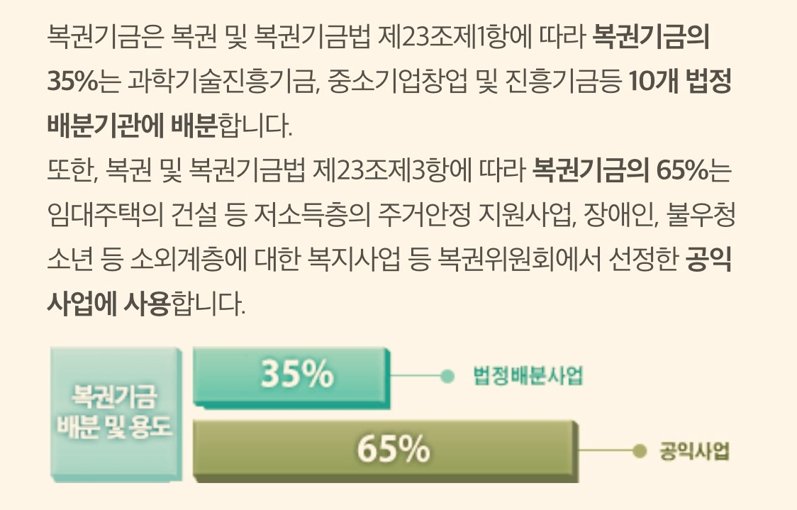 대략적이긴 하나 복권 판매금의 50%는 당첨금, 41%는 복권 기금, 9%는 복권 수탁사업자의 운영비로 쓰인다. 복권에 당첨된 극소수의 경우 당첨금을 받는다. (2022년 판매액 기준 3조 원 정도가 당첨금인데, 나머지 3조 원은 누가 챙겼을까?) 하지만 복권당첨금 중 당첨자가 나타나지 않아 소멸시효가 지나면 그 돈은 복권 기금으로 넘어간다. 복권 기금의 경우 35%는 과학기술진흥기금 등 10개의 법정 분배기관으로, 나머지 65%는 임대주택 건설 등 저소득층 주거안정 지원사업에 쓰인다. 복권 위원회의 홍보물을 살펴보면 복권 판매액을 누가 얼마나 가져가는가에 대한 내용은 없고, 늘 이 저소득층 주거안정과 같은 공익사업만을 중점으로 홍보한다. Dart(기업정보전자공시시스템)에 공시된 자료에 따르면 복권수탁사업자는 복권 운영으로 1.1% 정도의 수수료를 챙기는데, 최근 8년간 매출 성장률은 연평균 2.8%, 영업이익률은 4.9% 정도이다. 복권 판매액이 해마다 늘고 있다는 점을 감안하면 매출과 영업이익은 앞으로도 늘 것이다.