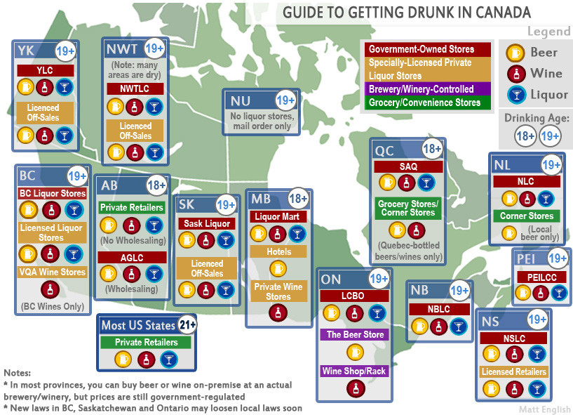 한국은 술도 하나의 일반 상품으로 성인이라면 슈퍼나 편의점 어디서나 쉽게 구입할 수 있지만, 캐나다에서 술은 주정부 관리 품목으로 BC 주는 BC Liquor Store와 온타리오 주는 LCBO등과 같은 주정부 직영 매장과 또는 술의 종류에 따라 허가된 Beer Store 나 Wine Store에서만 구입할 수 있다. 다만, 앨버타주는 개인 소유의 주류 판매점에서, 퀘벡주는 맥주나 와인은 편의점에서도 구입할 수도 있다.