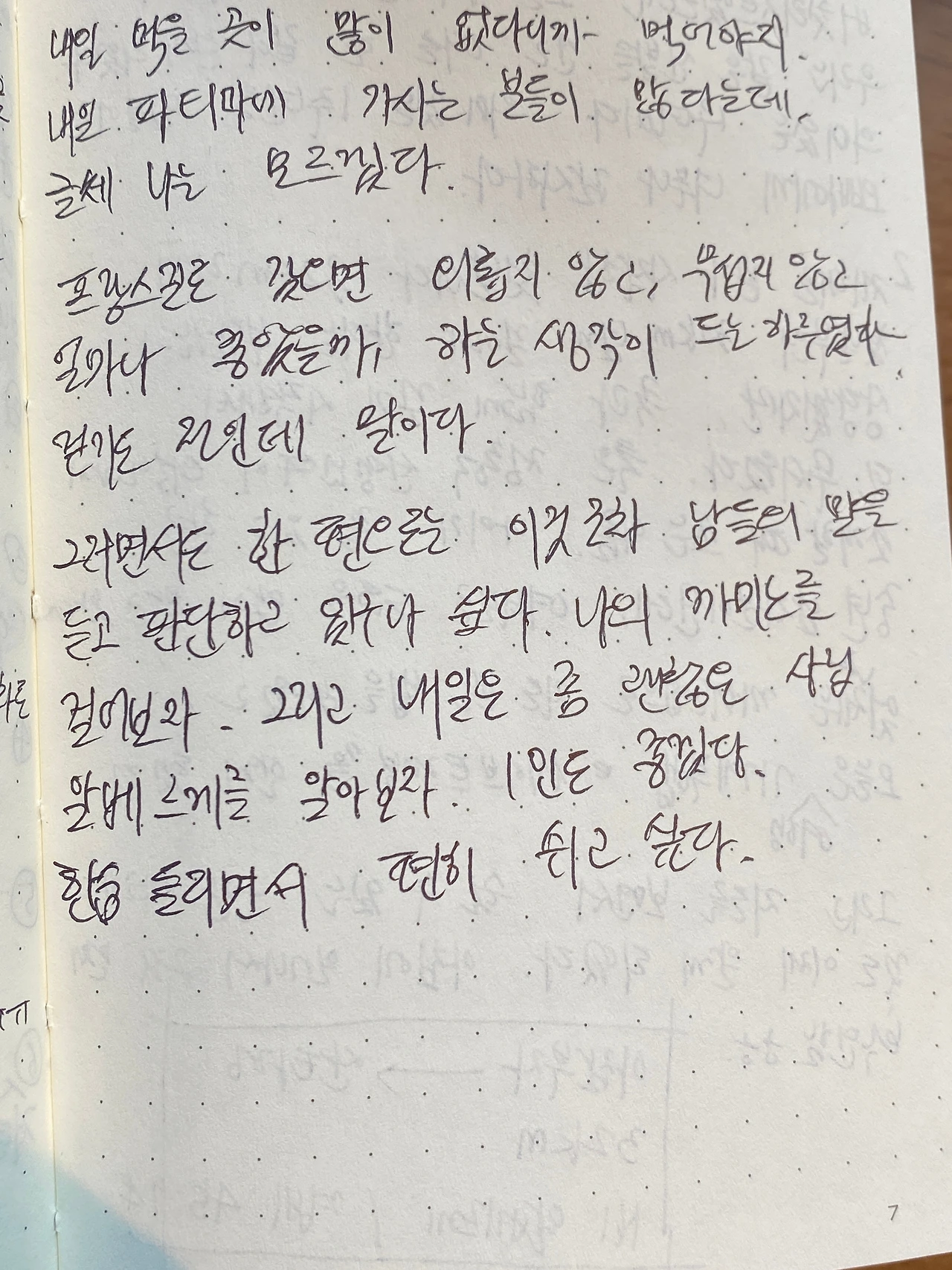 작은 남녀공용 화장실 옆에 달린 샤워실에서 대충 씻고 나왔다. 침대가 있는 방은 불이 꺼져있었고 오늘 하루 어디선가 걸어왔을 고단한 순례자의 코 고는 소리가 들렸다. 젖은 머리를 스포츠 타월로 둘둘 감아놓고 작은 불을 켤 수 있는 부엌으로 나왔다. 손바닥만 한 작은 일기장을 들고 테이블에 앉았다. 지금 느끼는 것들을 그대로 쭉 적어보았다.