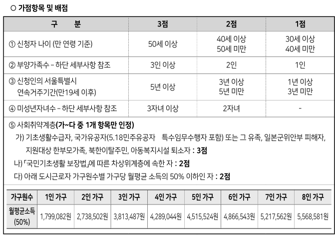 신청자 경쟁 시에는 가점 항목 배점 결과로 입주자를 선정한다고 한다. 나이, 부양가족 수, 서울 연속 거주 기간 등에 따라 가점이 추가된다고 하니 이 내용도 참고하자!