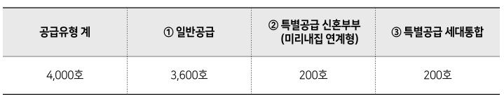 4,000개의 집을 일반공급 조건자에게 3,600개! 특별공급 신혼부부 조건자에게 200개! 특별공급 세대통합 조건자에게 200개! 나눠서 공급한다.