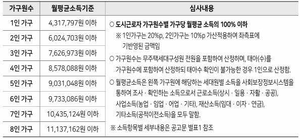 소득은 도시근로자 가구원수별 가구당 월평균 소득의 100% 이하여야 한다. 이게 무슨 말이냐면, 만약 1인 가구일 경우, 평균 월급이 431만원이하라면 조건에 소득 조건에 해당한다는 뜻이다! 현재 세대 가구원 수를 고려했을 때 여러분 월 평균 소득이 어느 정도 되는지 표를 통해서 확인해볼 수 있다.