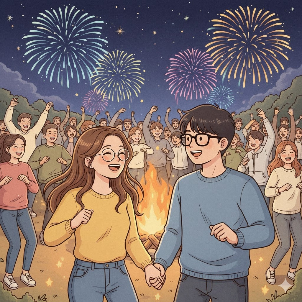 밤이 되자 화려한 공연과 함께 캠프파이어가 시작되었다. 형형색색의 불꽃이 하늘로 솟구치고, 겨울의 차가운 공기 속에도 사람들의 열기로 운동장은 달아올랐다.