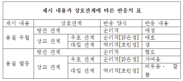 앞의 표에서 보는 바와 같이 비교 상황에 놓여있는 제시자와 수용자의 정애에서는 우수한 용질의 소유자에 대해서 반드시 긍정적 반응이 촉발되는 것이 아니라 부정적 감정이 지향될 수 있는 것이며 같은 이유로 열등한 용재의 소유자에 대해서도 이를 부정 감정으로 나타내는 것이 아니라 쾌적 감정인 쾌재를 외치는 일이 가능하다. 즉 그들의 서로 간의 관계에 따라서 제시의 용질에 관한 수용자의 반응이 순리적으로이거나 역리적으로 촉발된다.