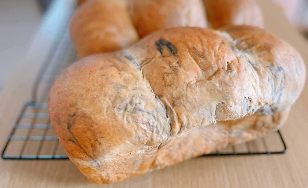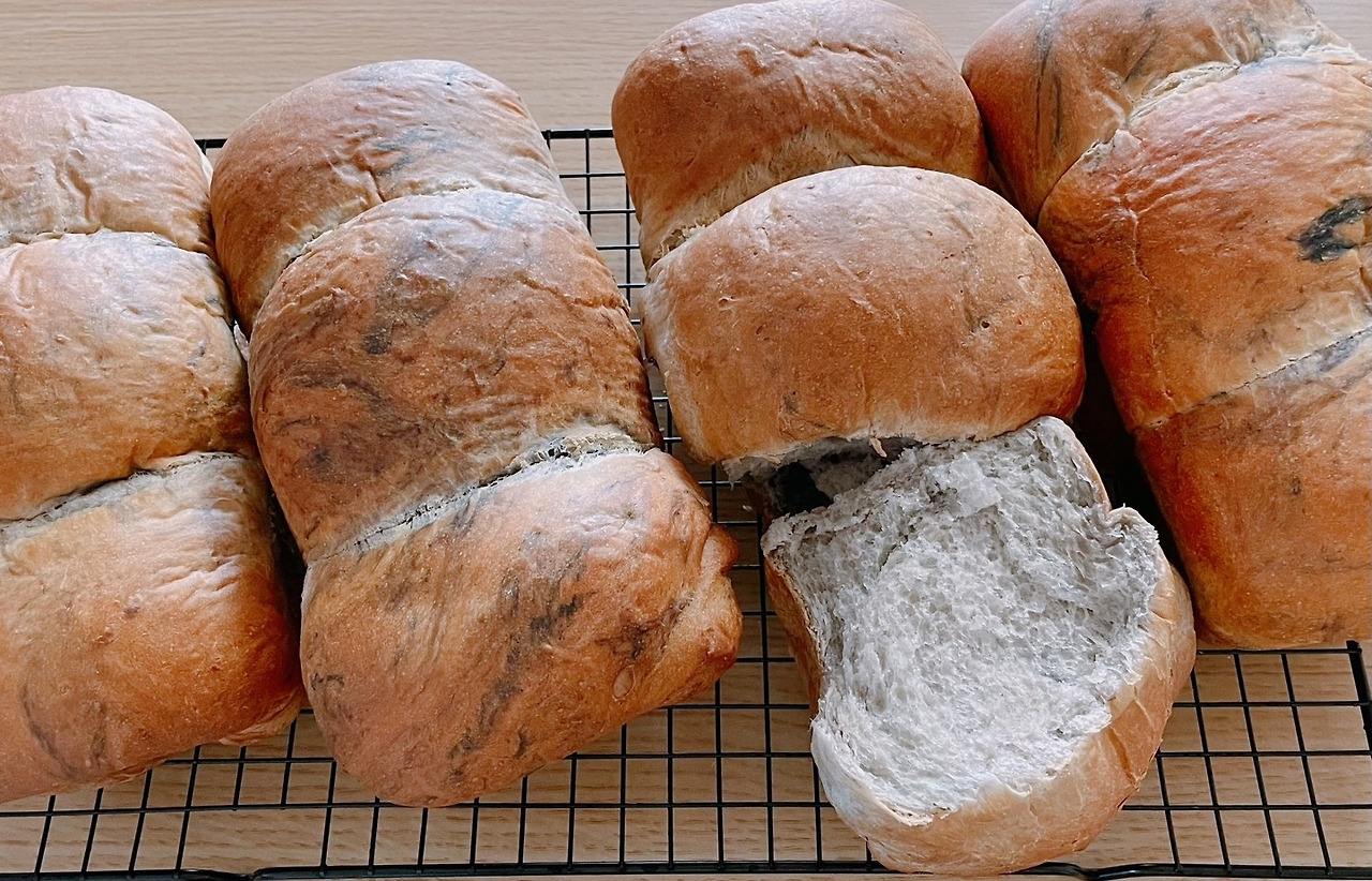 그런데 그 난장판을 한구석에 짜져서 내내 지켜보던 보라색 파우더놈이 그제야 내 눈에 띄었다. 색소를 잘 시도하진 않지만 재료란 뭐든지 있으면 좋다는 생각에 받아둔 게 '오냐 너 잘 걸렸다, 식빵에 좀 들어가야겠다' 하면서 충동적으로 빵 반죽 마지막에 투입되었다. 잘하면 마블식빵처럼 되겠지 하는 건방진 생각에.