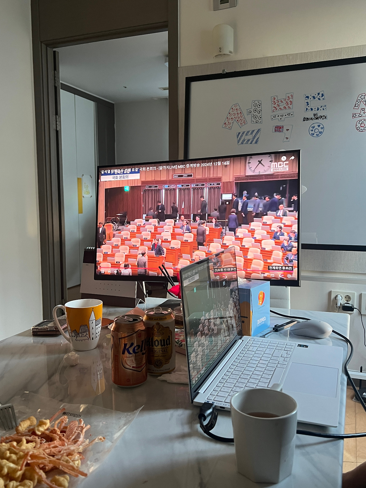이날은 독서모임의 송년회날이기도 했다. 하지만, 날이 날인지라 여의도로 가는 특파원분들이 많아 2차 송년회는 작년에 비해 소규모 인원만이 함께했다. 여의도 특파원으로 이동한 인원 외에 남은 멤버들은 정_의 작업실에서 송년회라는 이름 아래, 전투복을 입은 채 투표 방송을 실시간으로 지켜보며 대한민국의 밝은 밤을 간절히 기원했다.