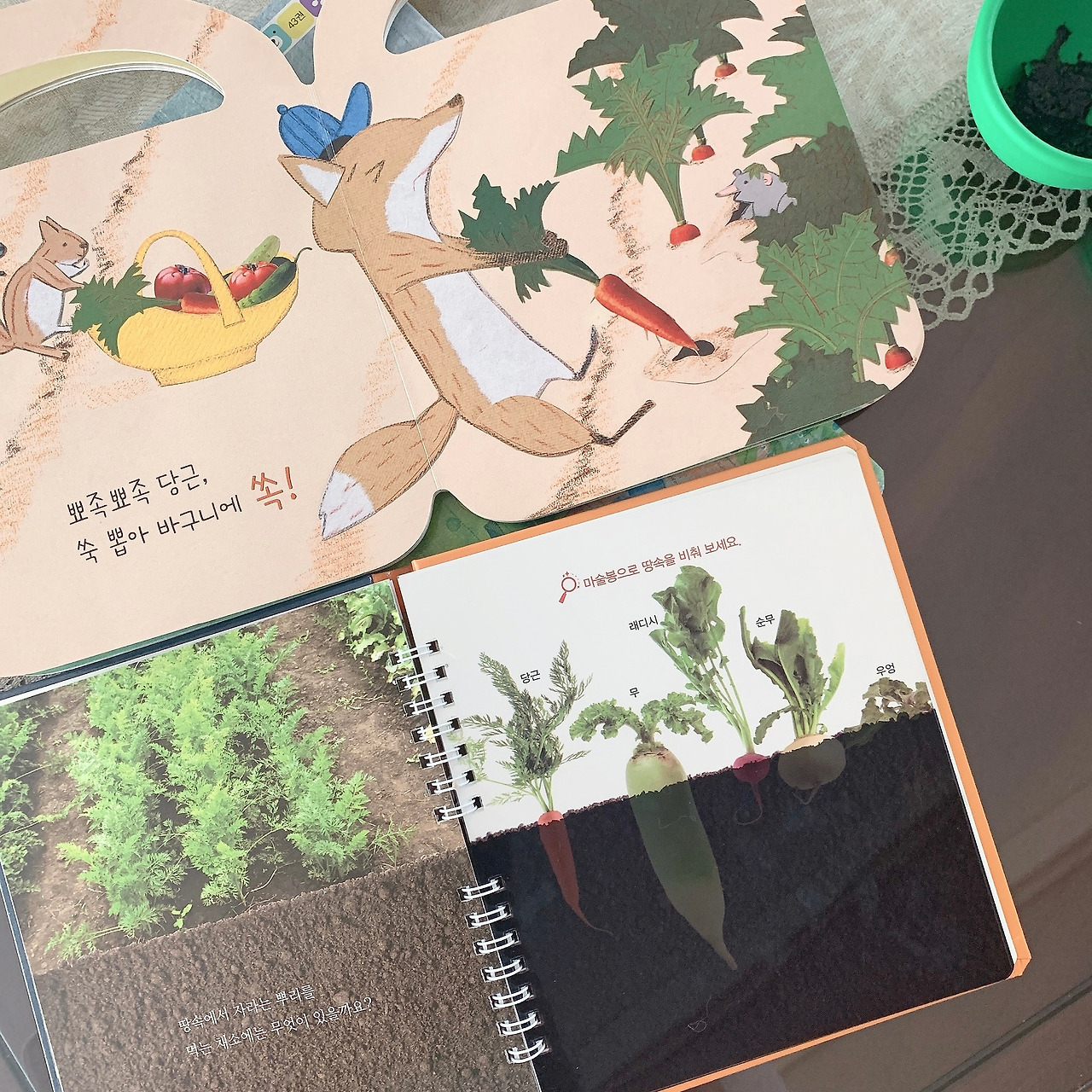 다양한 채소를 소개하면서도 비슷한 류를 구분해 놓으니 독자 입장에서 더 이해하기 쉽다. 가령 호박-수박-오이-참외를 함께 묶어 보여주는 식이다. 평소 즐겨먹는 당근과 감자도 땅에 묻혀 있는 모습을 들여다보게 하니 엄마도 아이도 흥미롭다. 놀이처럼 습득하니 일석이조! 엄마만 재미있는 거 아니지?