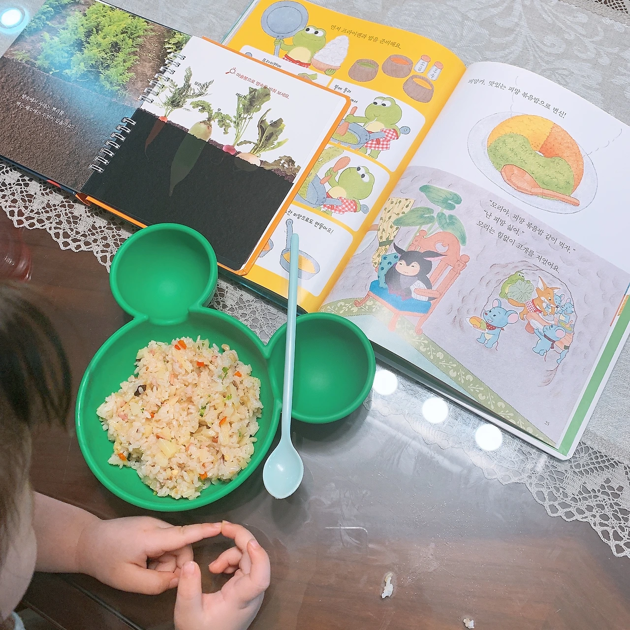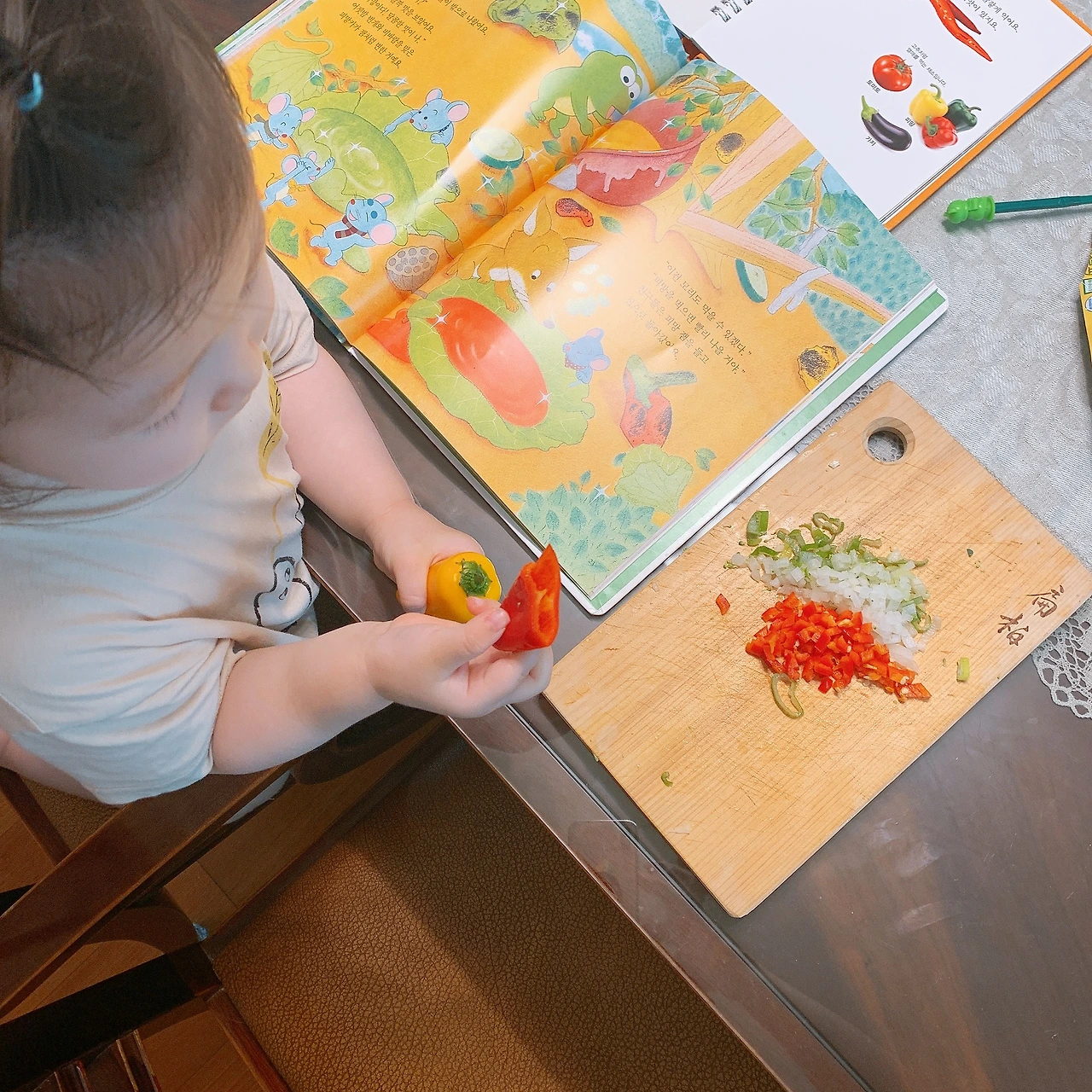 내용에 등장하는 피망볶음밥을 따라한 야채볶음밥을 함께 해주니 더 잘 먹는다 ㅎㅎ 스텝스에 <밥 먹자!>와 연계해도 좋을 것 같아서 오후에 한번 더 읽어줬다.