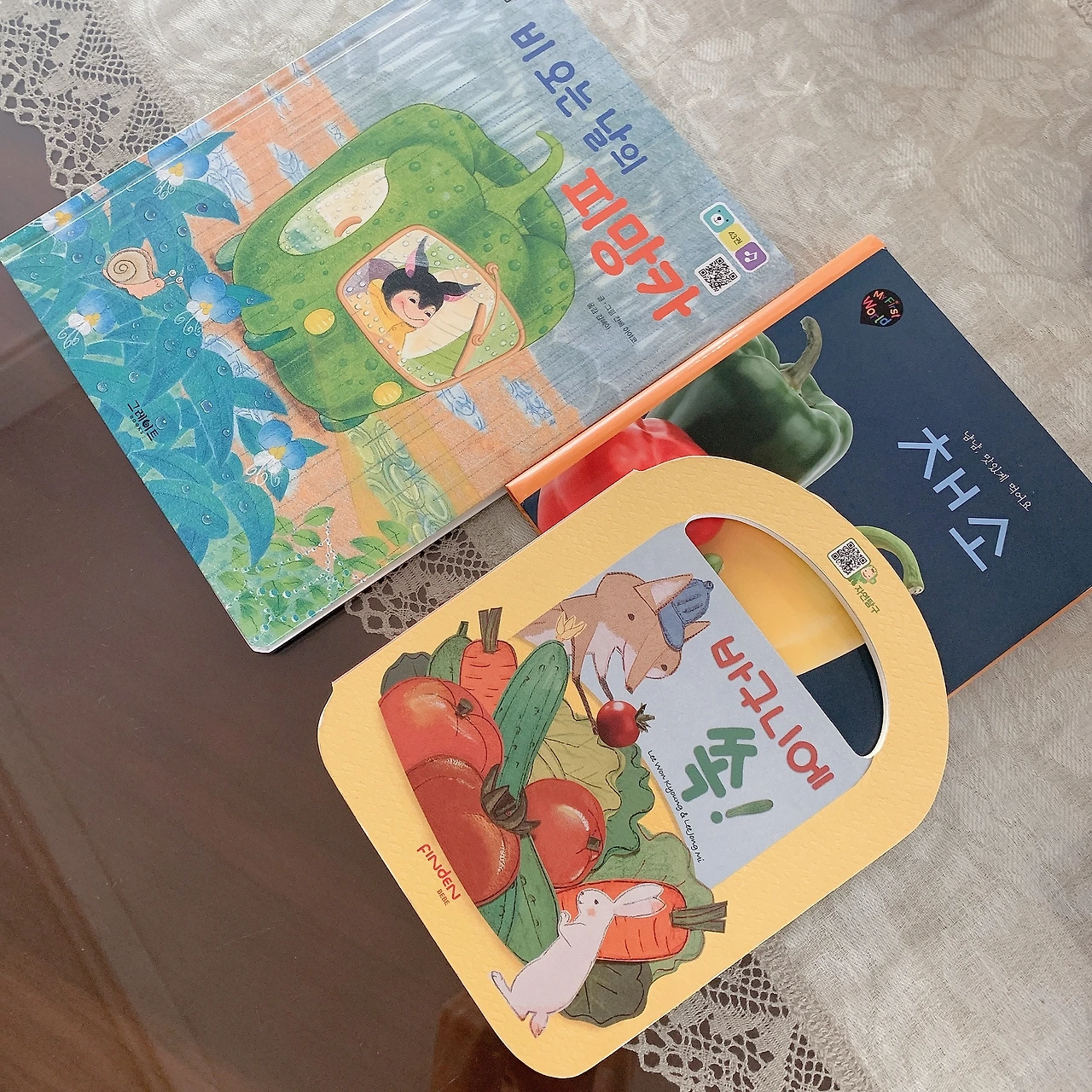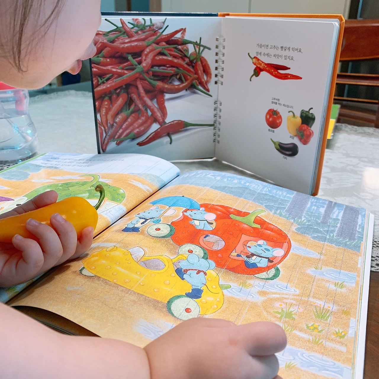 브로콜리와 당근, 파프리카, 양배추를 모두 잘 먹는다. 콩은 밥에서 골라 먹을 정도로 좋아하고 ㅎㅎ 시슴치나 청경채도 곧잘 먹었는데 18개월 이후에는 단독으로는 잘 먹지 않는다. 이런 식습관 형성에는 그림책이 한몫한다. 토끼가 좋아하는 당근, 나무처럼 생긴 브로콜리라고 알려주면 아기에게 먹을 명분이 생기는 것. 오늘은 그물독서 주제를 ‘채소’로 잡고 도레미곰에서 가장 좋아하는 책인 <비 오는 날의 피망카>를 꺼내줬더니 파프리카를 달래서 마구 먹는다 ㅎㅎ 돌 전부터 즐겨보던 <바구니에 쏙!>도 가지고 왔다. 여우네 채소밭에서 가져온 것들이라고 하니 좋아한다.