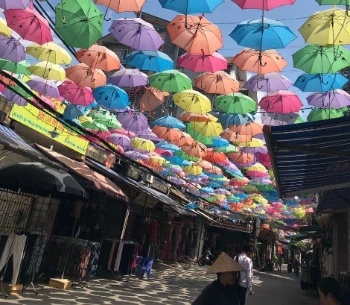 사람이 걷는 길을 사이에 두고 양쪽으로 실크를 파는 가게들이 쭉 늘어서 있는데, 그것보다 더 먼저 눈에 들어온 건 알록달록한 색깔의 작은 우산들이 파란 하늘밑에 마치 지붕처럼 매달려 있는 것이었다.