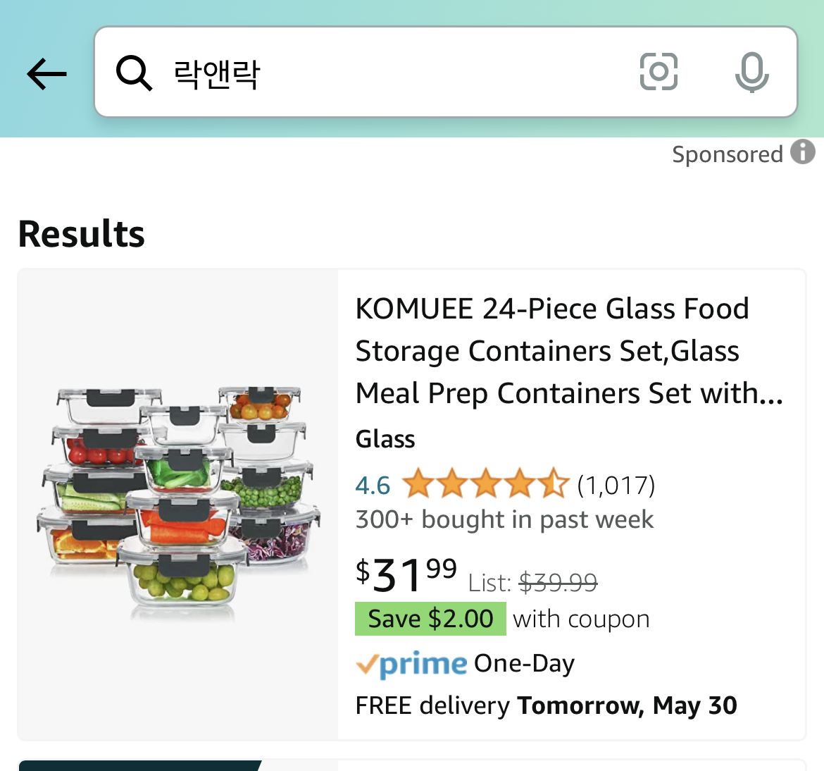 특히, 미국 생활 초창기 생필품 구매에 필요한 아마존 앱. 하루면 배송이 온다. 과장 좀 보태서 미국인 중에 아마존 안 쓰는 사람은 없을 것이다.