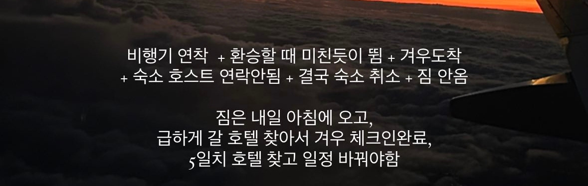 이전 이야기 요약 : 비행기 연착 + 숙소 강제 취소 + 짐 도착 안 함