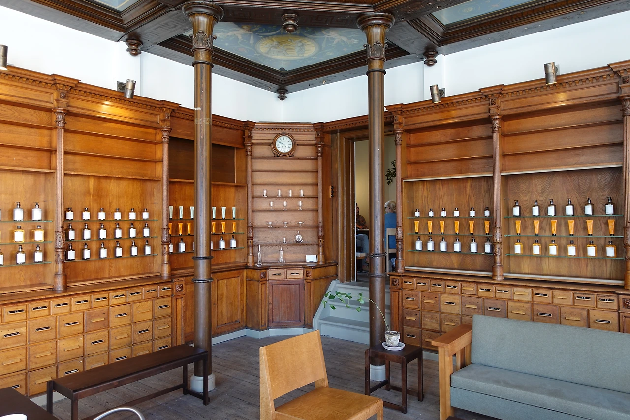 재료 본연에 충실한 디자인으로 Timeless design추구하는 브랜드답게 캐릭터가 확실한 인테리어였다. 이 공간은 1878년에 만들어진 약국(St.Paul's Apotek)을 리모델링하여 원래 모습 그대로를 많이 살렸다고 한다. 그래서인지 천장과 벽면의 가구, 기둥 같은 앤틱 한 디자인이 더 압도적으로 다가왔다.