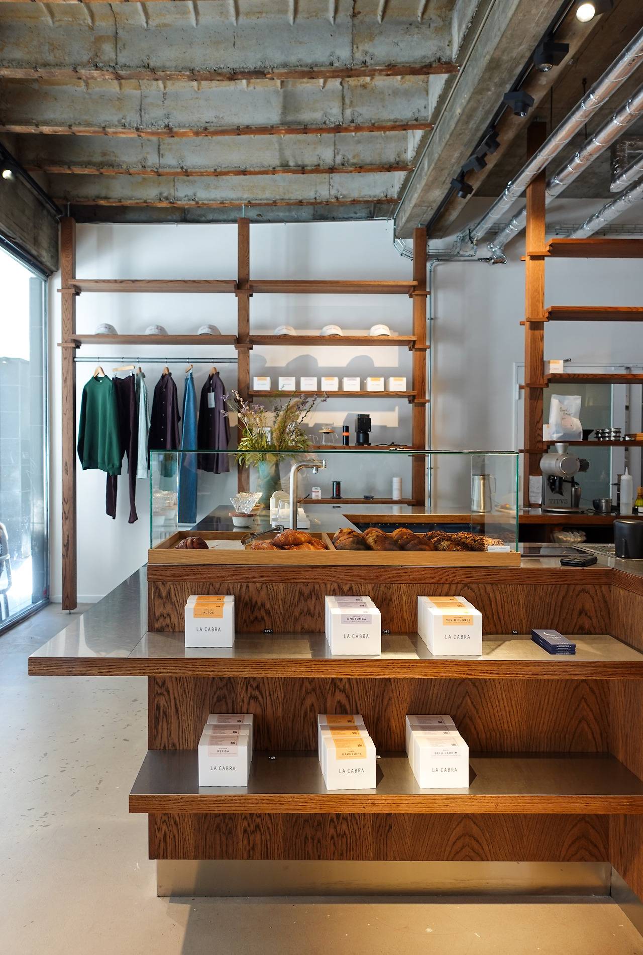 패션 브랜드 Another Aspect 매장 안에 LA CABRA의 커피와 베이커리를 맛볼 수 있는 카페가 있다. 매장 앞에 테이블이 있어서 노트북으로 작업하며 커피를 마시는 사람들도 있고, 스툴에 가볍게 앉아 즐기는 사람들도 있었다. (LA CABRA의 원두를 한국에서는 용산 트래버틴에서 살 수 있다.)