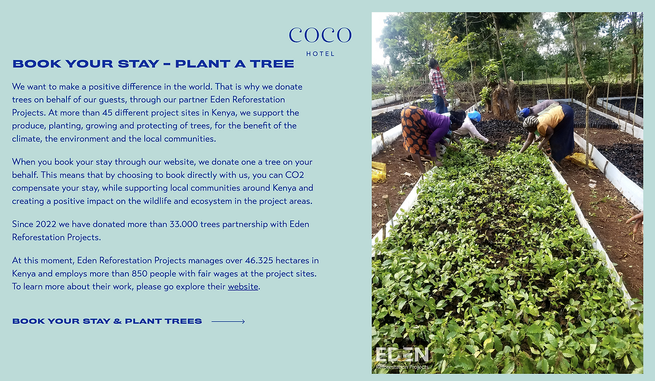 중요한 그들의 운영방침. '지속가능성'을 추구하는 것은 이제 코펜하겐 어느 카테고리에서나 기본이 되는 것 같았다. 하지만 이 호텔에서 인상 깊었던 것은 태양열 에너지를 사용하는 것과 BOOK YOUR STAY - PLANT A TREE라는 제도로 하루 숙박예약을 할 때마다 케냐에 나무를 기부/심어주는 Eden Reforestation Projects를 진행하고 있는 것. 현지에서 이 프로젝트로 공정 고용도 진행하고 있고, 이미 나무 3만 그루 이상을 기부했다고 한다. 내 여행이 직접적으로 어딘가에 좋은 영향을 줄 수 있다는 것이 신기했다.