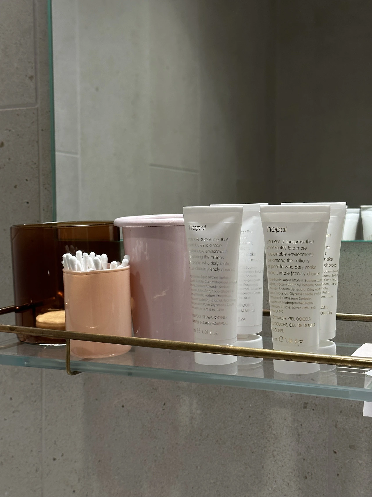 욕실 집기는 모두 HAY(헤이), 어메너티는 hopal이라는 브랜드로, hopal은 처음 들어보는 이름이라 찾아보았다. 해외여행을 하면 샴푸나 트리트먼트가 잘 안 맞는 경우가 많아서 집에서 쓰던걸 챙겨갔는데 이번에는 거의 쓸 일이 없을 정도로 어메너티가 좋았다.