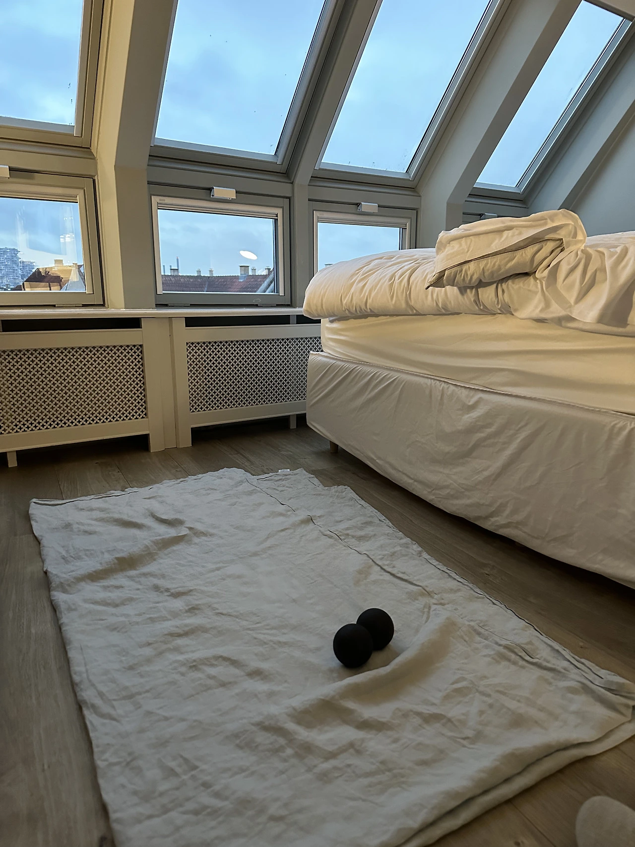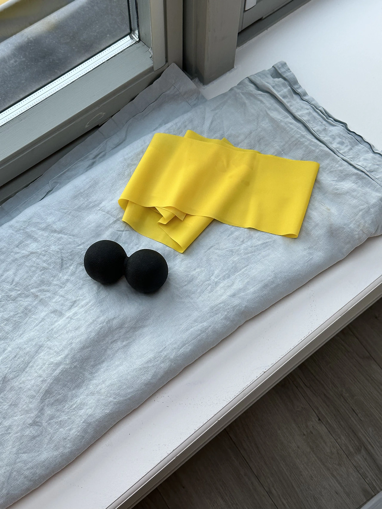 전날 기차여행으로 쌓인 피로가 근육 곳곳에 뭉쳐 풀어주기로 했다. 담요를 매트 삼아 바닥에 깔고 마사지볼과 라텍스 밴드로 시원하게 스트레칭해 주니 잠이 깨고 눈이 뜨인다.